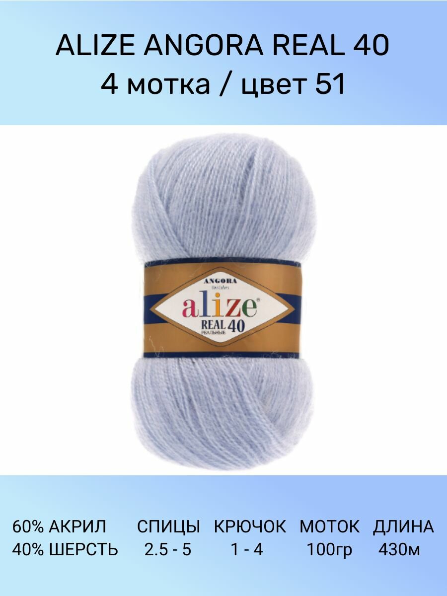 Купить Пряжа для вязания ALIZE Angora Real 40 Ализе Ангора Реал: 51 (светло-голубой), 4 шт 430 м 100 г, 40% шерсть 60% акрил