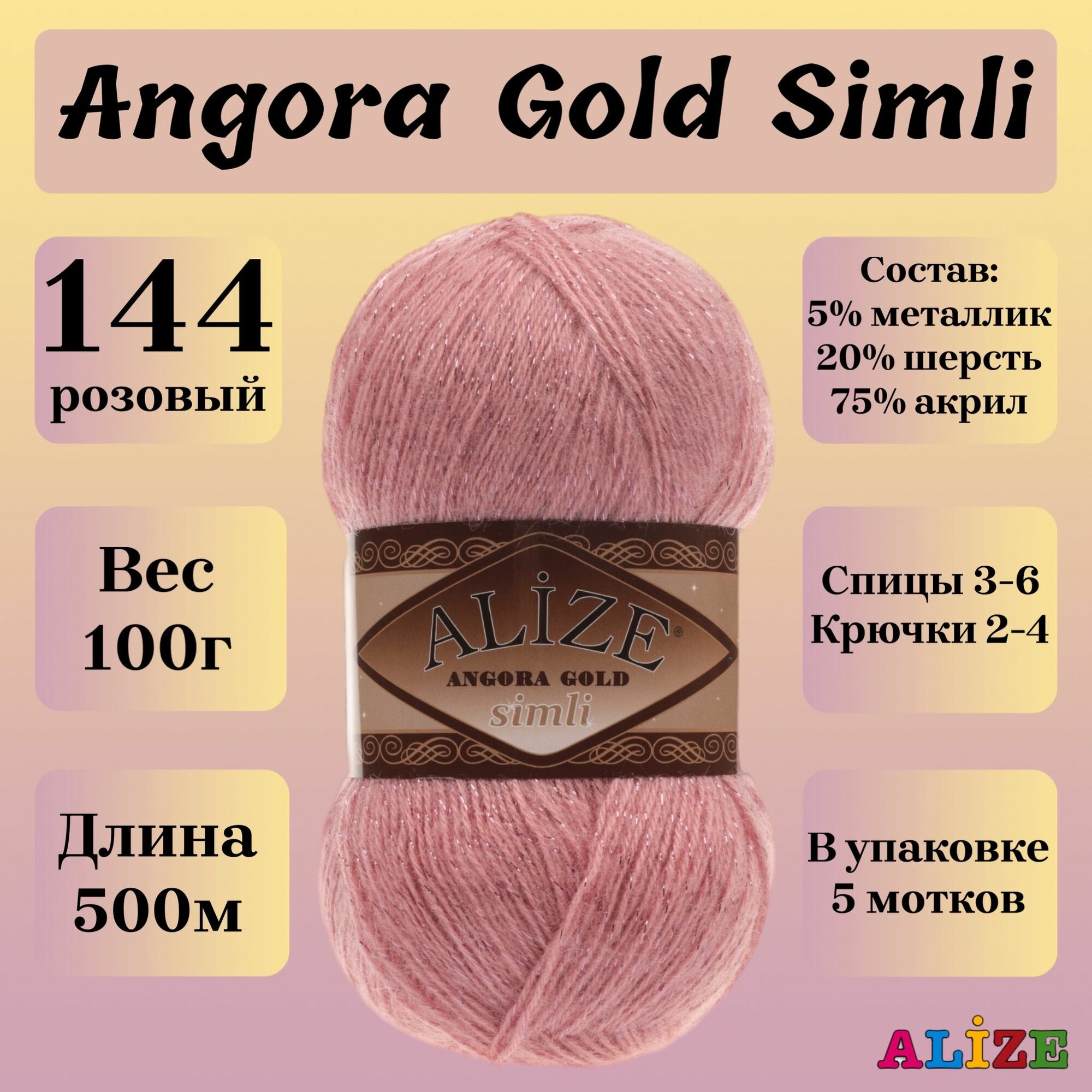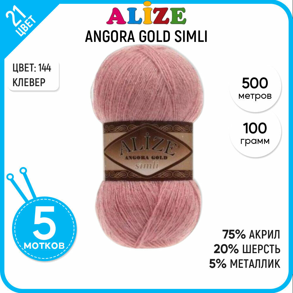 Пряжа для вязания ALIZE 'Angora Gold Simli', 100г, 500м (20% шерсть, 5% металлик, 75% акрил) (144 темная пудра), 5 мотков
