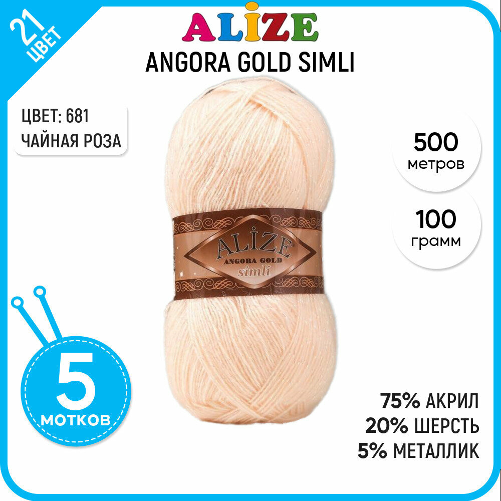 Пряжа для вязания ALIZE Angora Gold Simli Ализе Ангора Голд: 363 (розовый персик), 5 шт 500 м 100 г, 5% металлик, 20% шерсть, 75% акрил