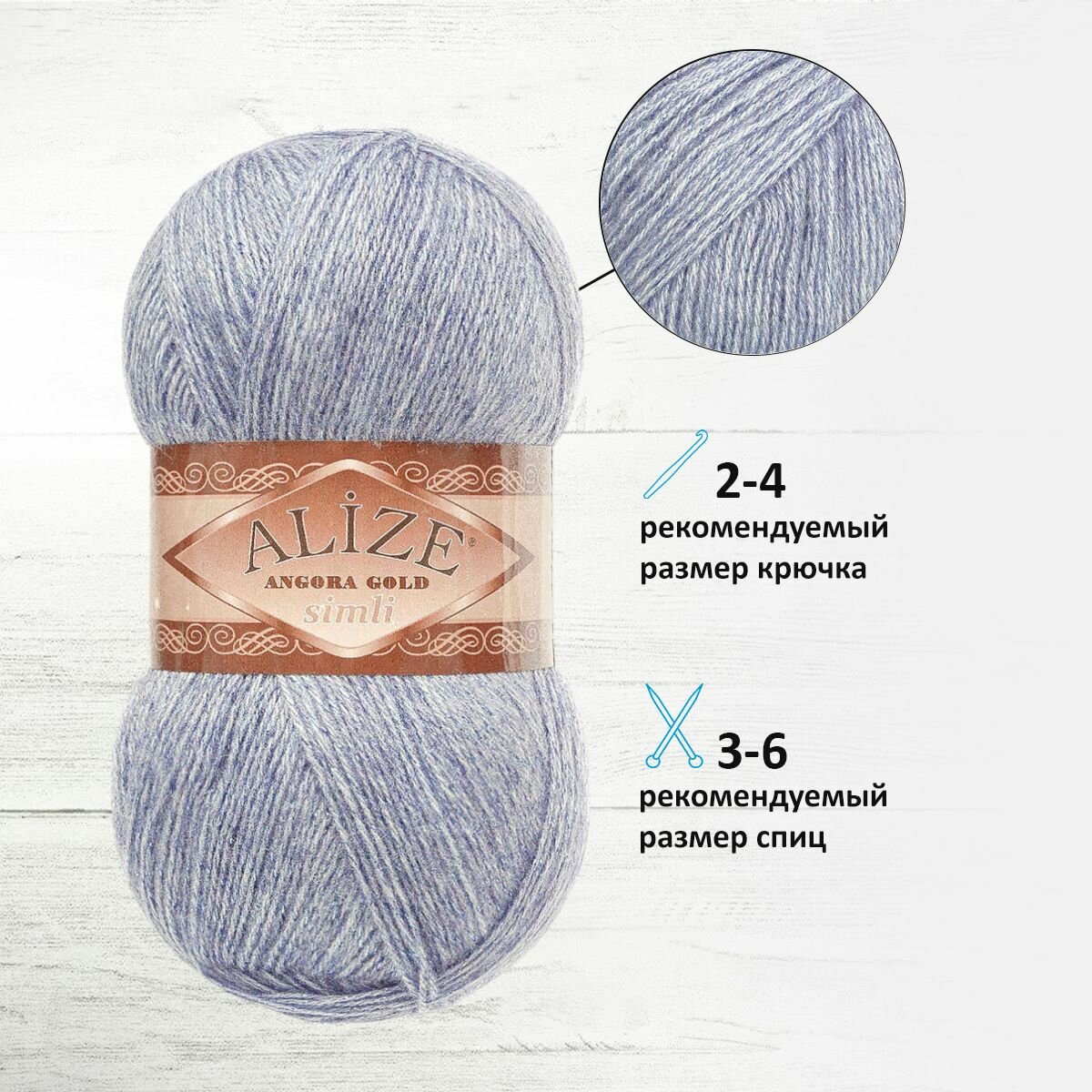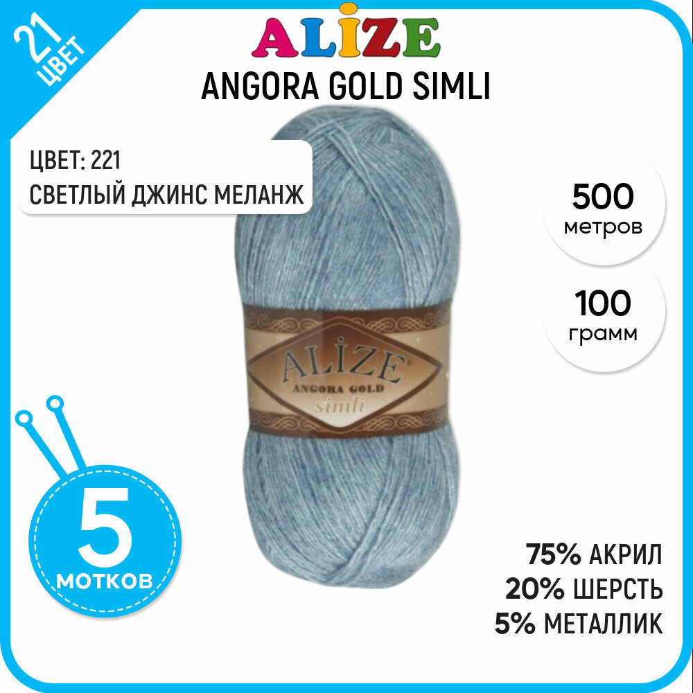 Пряжа ALIZE ANGORA GOLD SIMLI, светлый джинс - 221, 5% металлик, 20% шерсть, 75% акрил, 5 мотков, 100 г, 500 м.