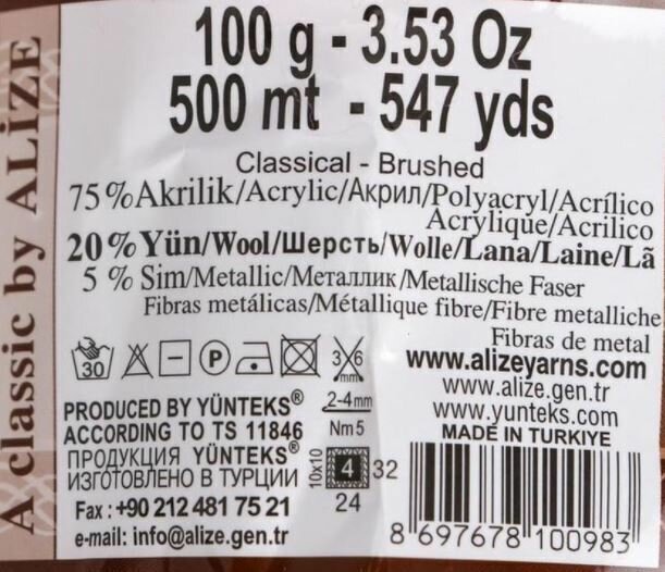 | Состав | 20% шерсть / 75% акрил / 5% люрекс |
