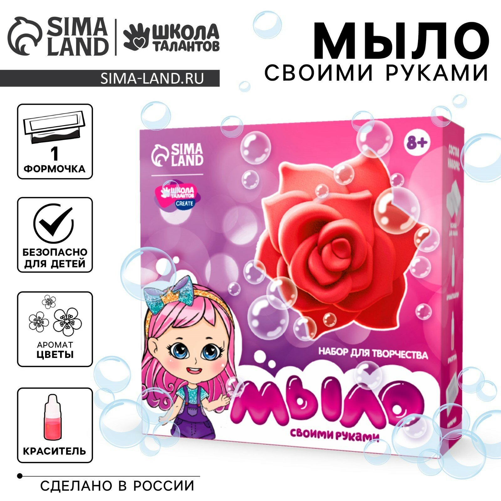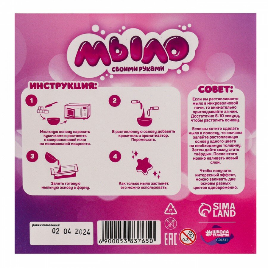 | Комплектация | мыльная основа, краситель, ароматизатор, формочка, инструкция |