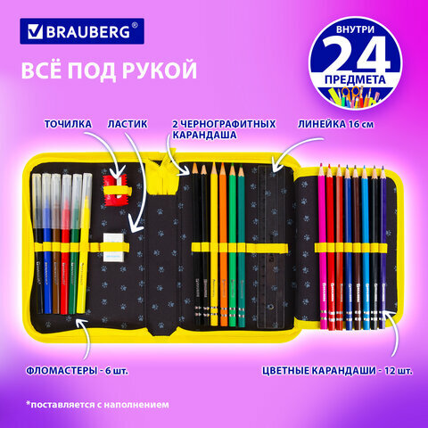 Пенал Brauberg с наполнением, 1 отделение, 1 откидная планка, 24 предмета, 21х14 см, Dark cat, 272351