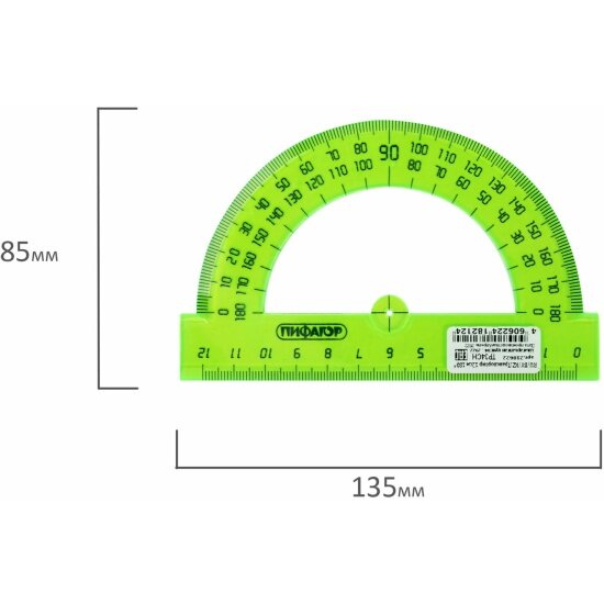 Транспортир 12 см, 180 градусов, пифагор, прозрачный, неоновый, ассорти, 210622, 8 штук