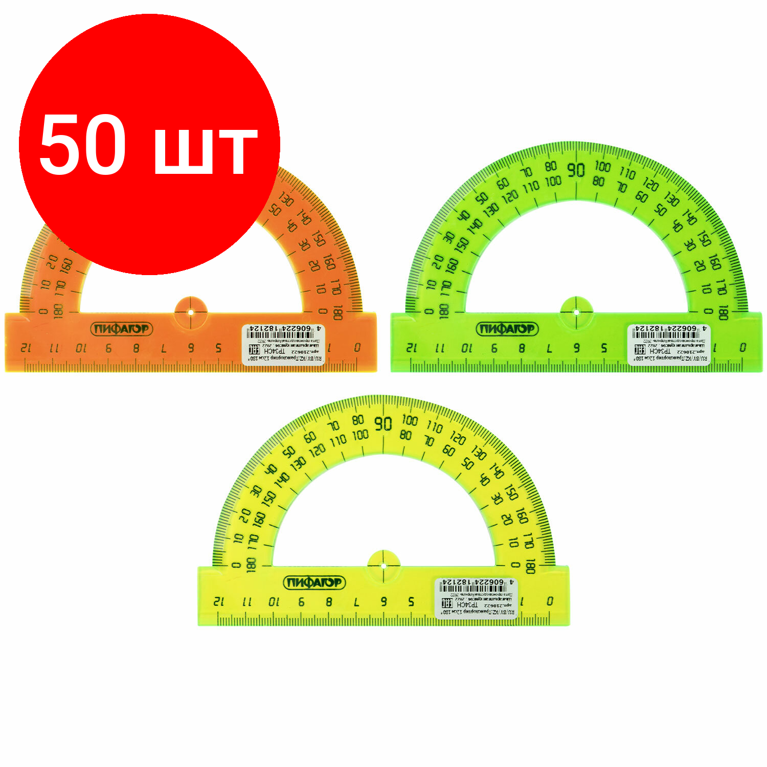Купить Комплект 50 шт, Транспортир 12 см, 180 градусов, пифагор, прозрачный, неоновый, ассорти, 210622