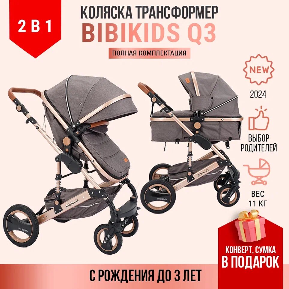 Купить Детская коляска трансформер 2 в 1 BibiKids Q3, люлька для новорожденных и прогулка до 3-х лет, Серая