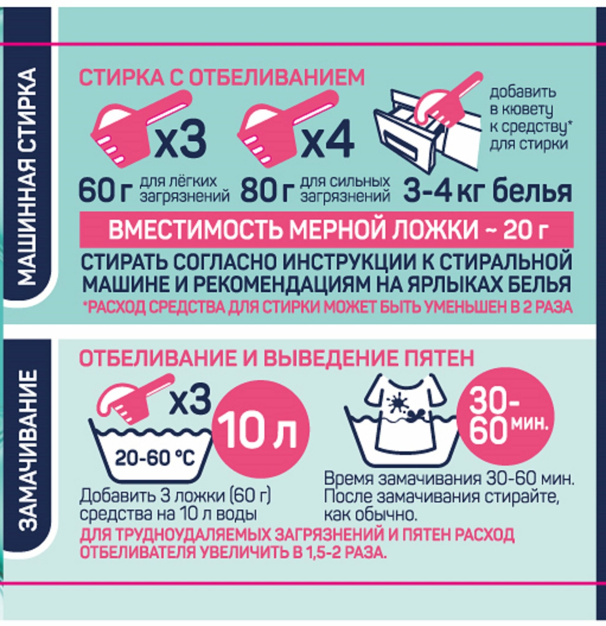 | Способ применения | На 3–4кг белья: 50–70г – слабые загрязнения 70–80г – сильные загрязнения. Отбеливание, выведение пятен: – изделия из хлопка, льна, вискозы, штапеля, синтетические ткани – 70г. Для трудноудаляемых загрязнений и пятен расход отбеливателя увеличить в 1,5 раза. Не использовать для непрочно окрашенных тканей. Соблюдать рекомендации на ярлыках одежды. Не смешивать с хлорсодержащими отбеливателями. |