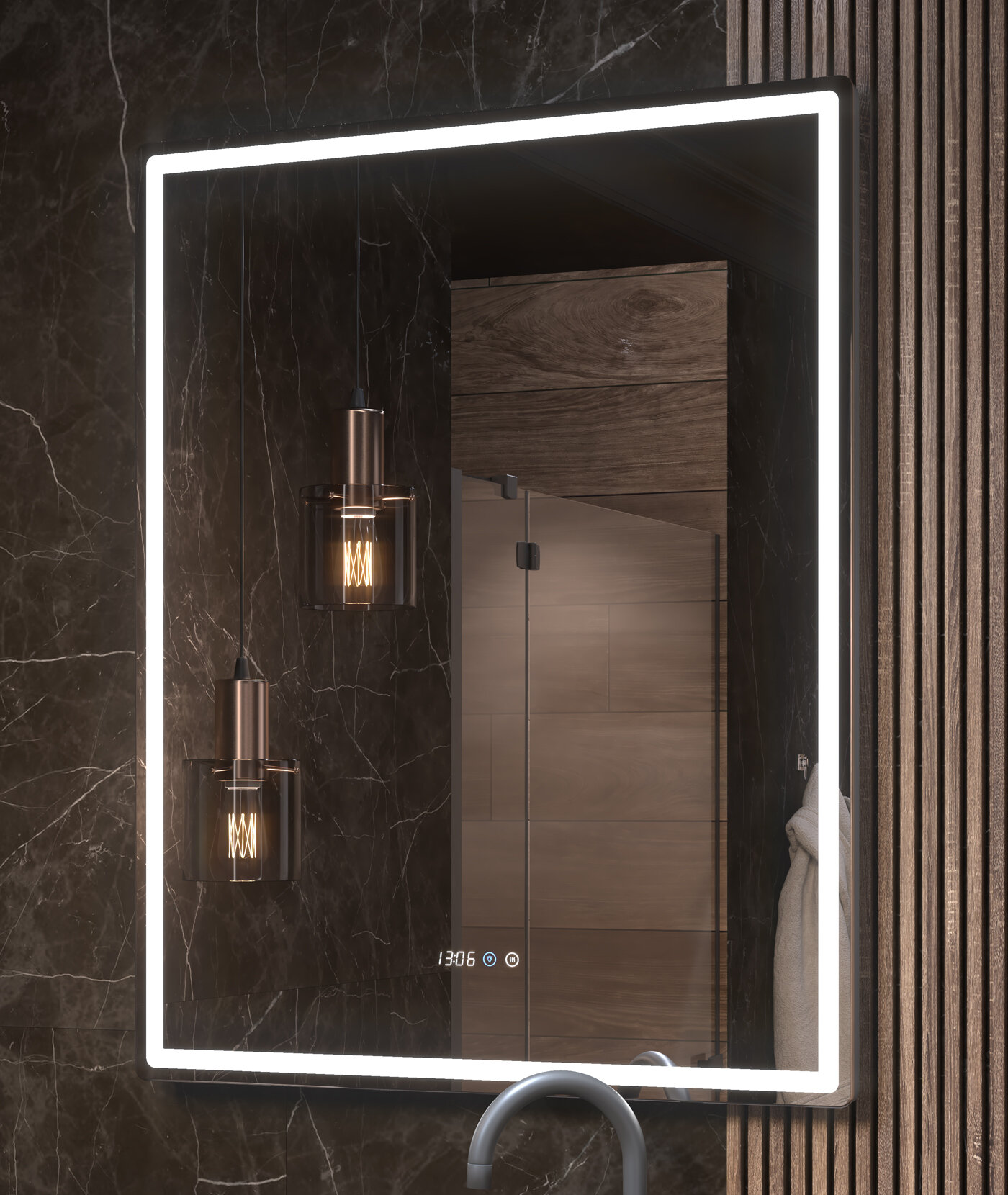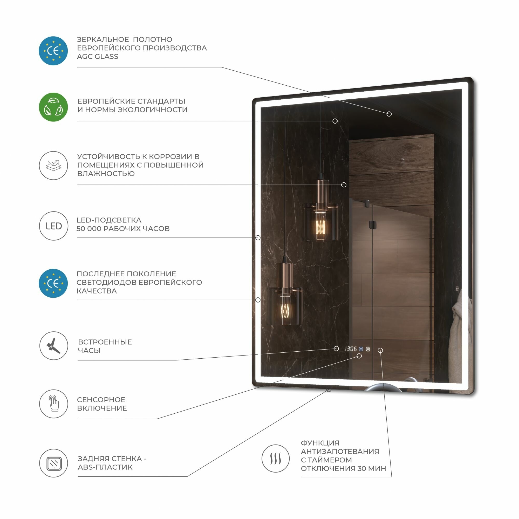 | Особенности | без рамы, подогрев, подсветка, с часами, сенсорный выключатель подсветки |