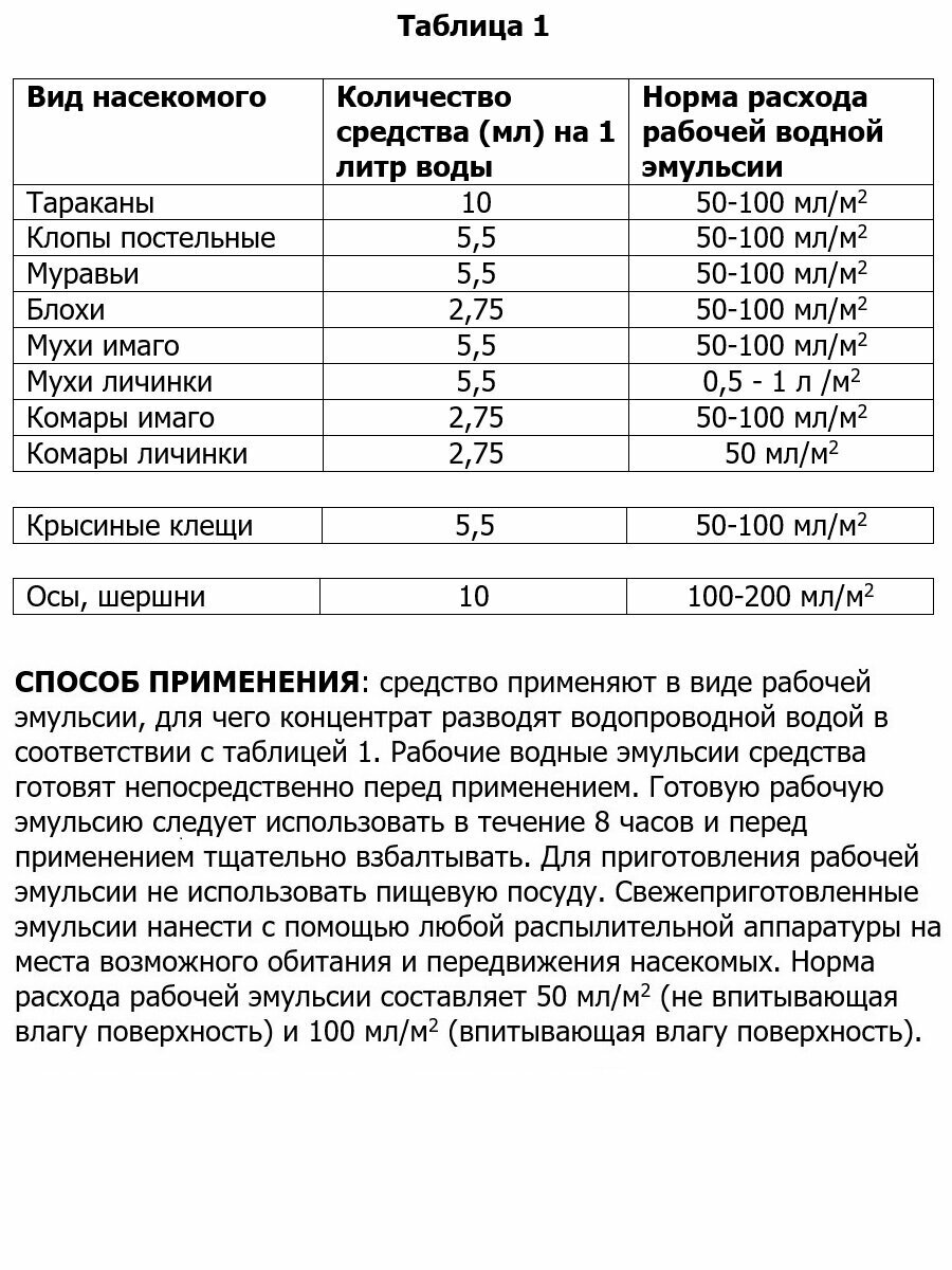 | Способ применения | Средство необходимо развести с водой в пропорциях: клопы, муравьи, мухи, крысиные клещи: 5,5 мл на 1 литр; тараканы, осы: 10 мл на 1 литр. С помощью любого опрыскивателя обработать места передвижения и обитания насекомых. 50 мл средства достаточно для обработки 5 соток дачного участка. Соблюдайте меры предосторожности. |