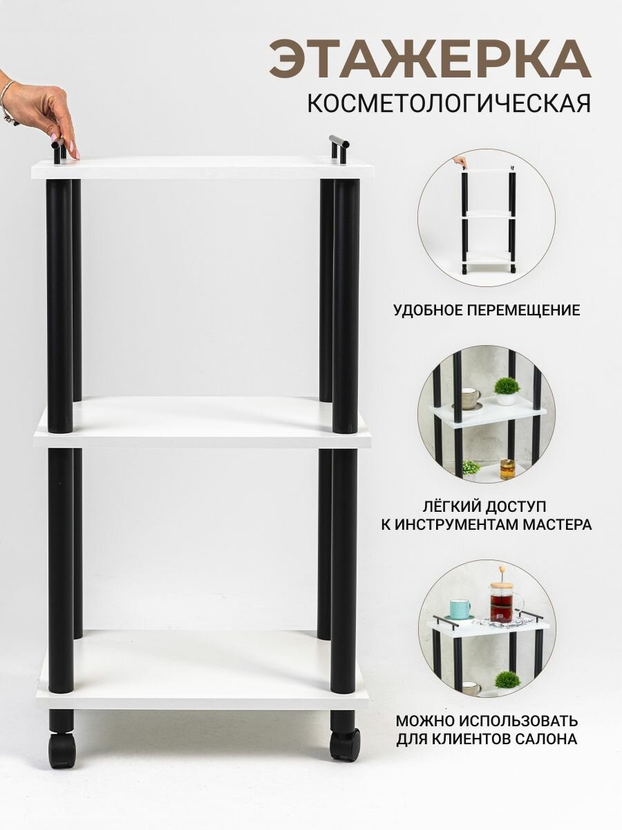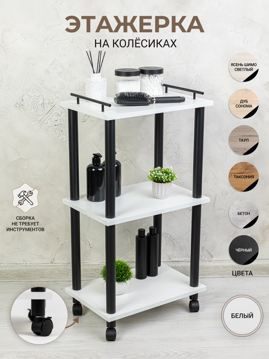 Стеллаж для кухни на колесах GASTRORAG 0770/3, этажерка для ванной на колесиках, тележка косметологическая, 3 полки ЛДСП, размеры 45 х 30 х 82 см