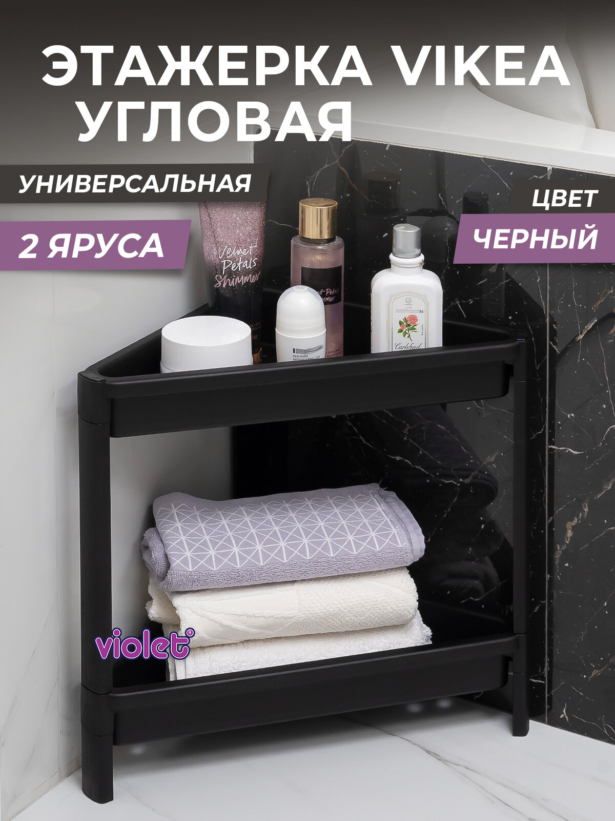 Этажерка для ванной 2х ярусная VIKEA угловая, цвет черный / Стеллаж напольный для кухни / Органайзер для хранения вещей универсальный пластиковый