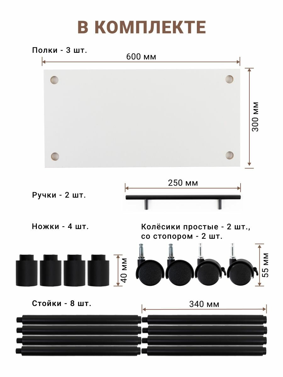 | Дополнительная информация | Стойка пластиковая - 8 шт; Полка ЛДСП - 3 шт; колеса из пластика - 4 шт |