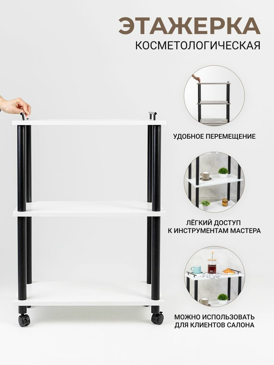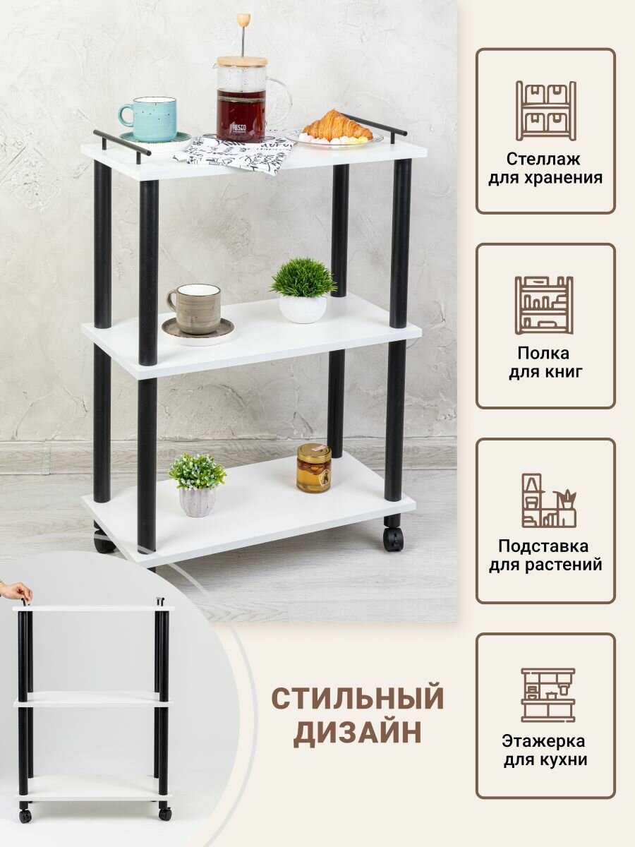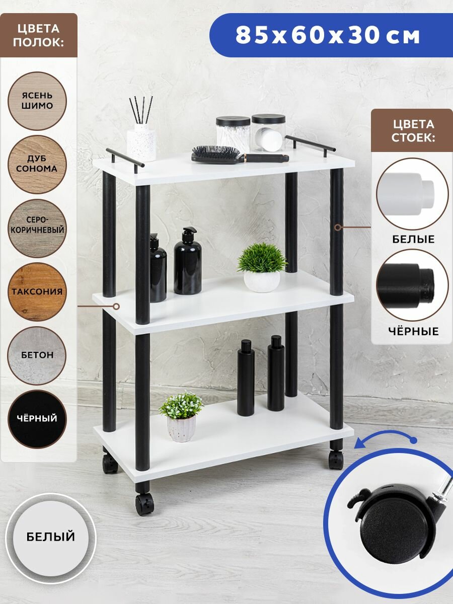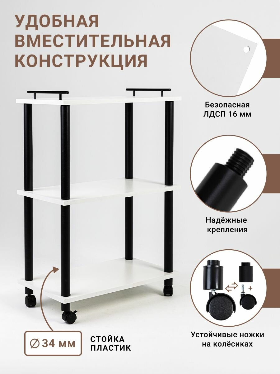 Стеллаж для кухни на колесах GASTRORAG 0770/3, этажерка для ванной на колесиках, тележка косметологическая, 3 полки ЛДСП, размеры 60 х 30 х 82 см