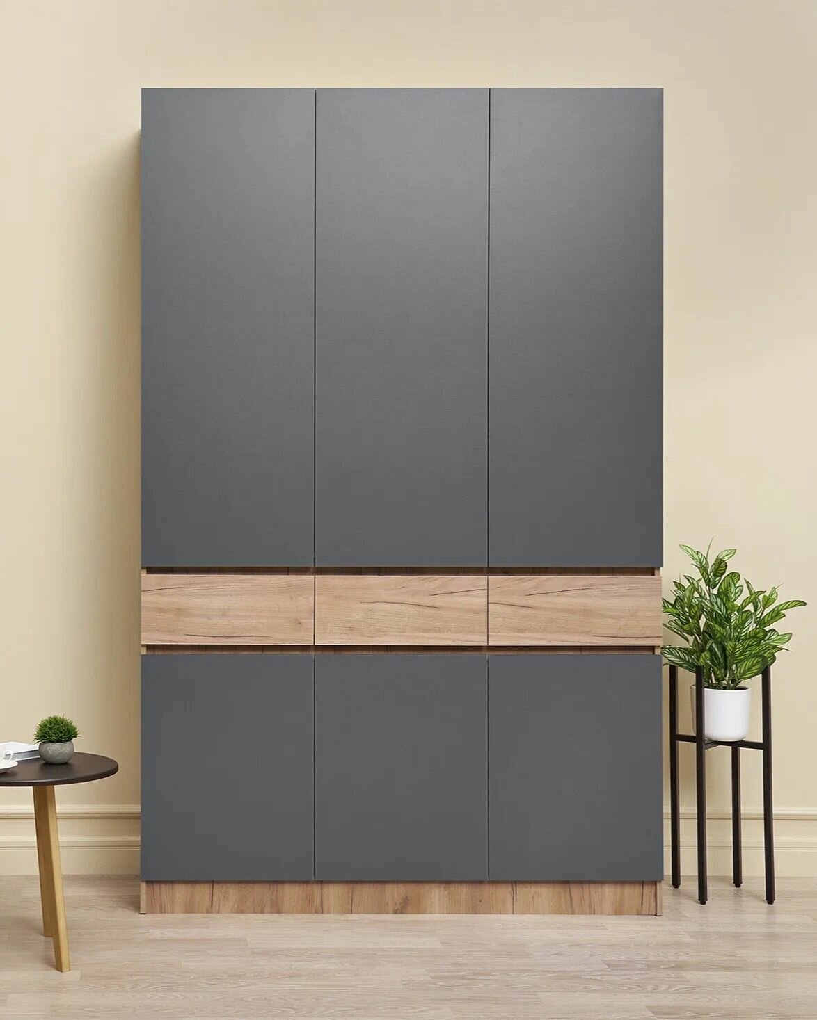 Высокий шкаф с ящиками для одежды Миф Роджина трехстворчатый Графит/ Дуб крафт белый, размер ШхГхВ 1500х520х2400мм