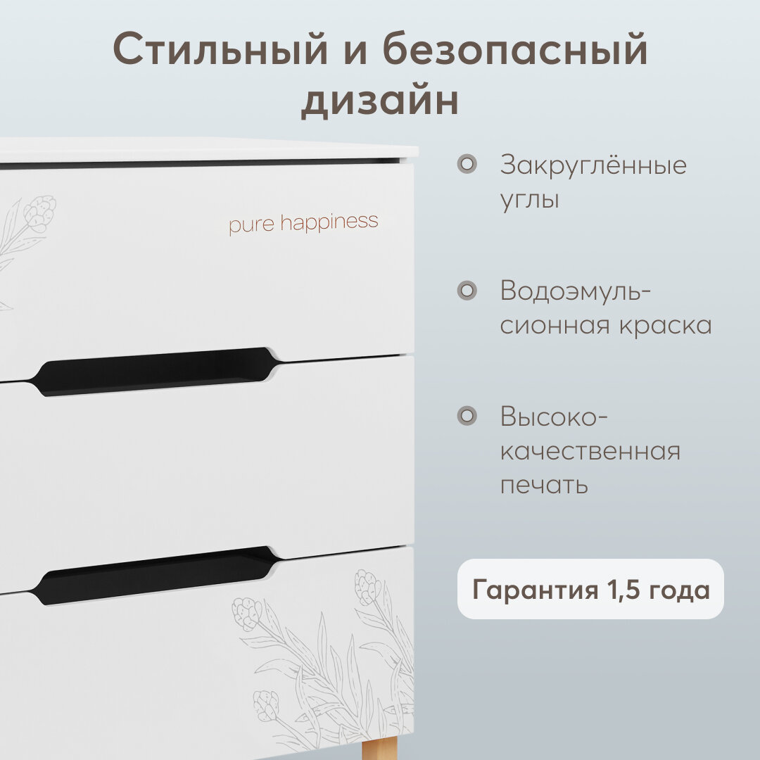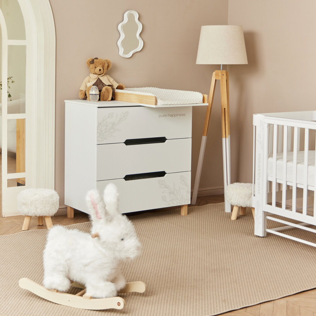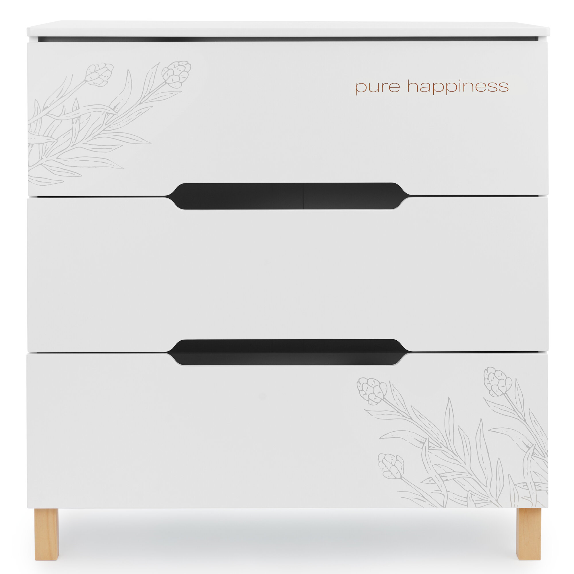 91036, Комод FIOKI с пеленальным столиком, деревянный, ножки из натурального массива березы, 3 ящика, 90,2х53,5х94,5 см, белый