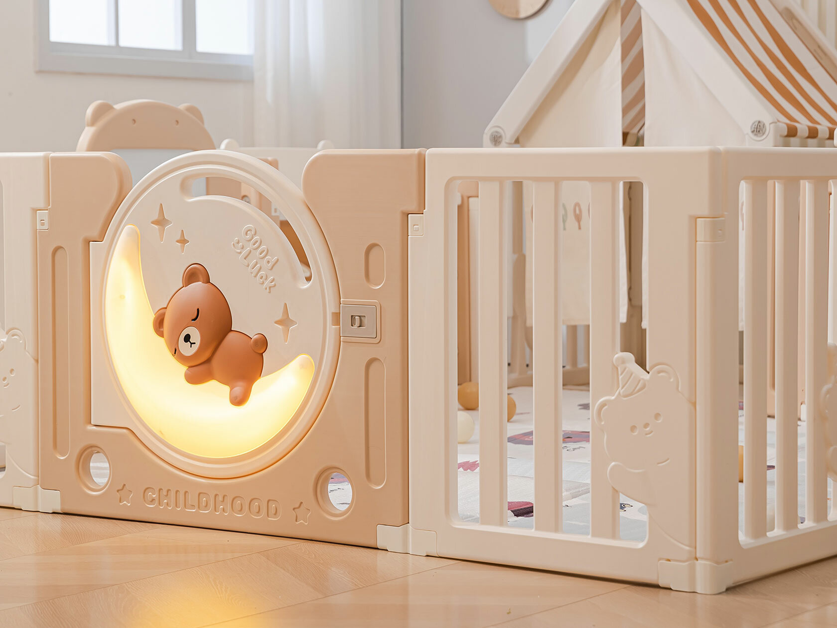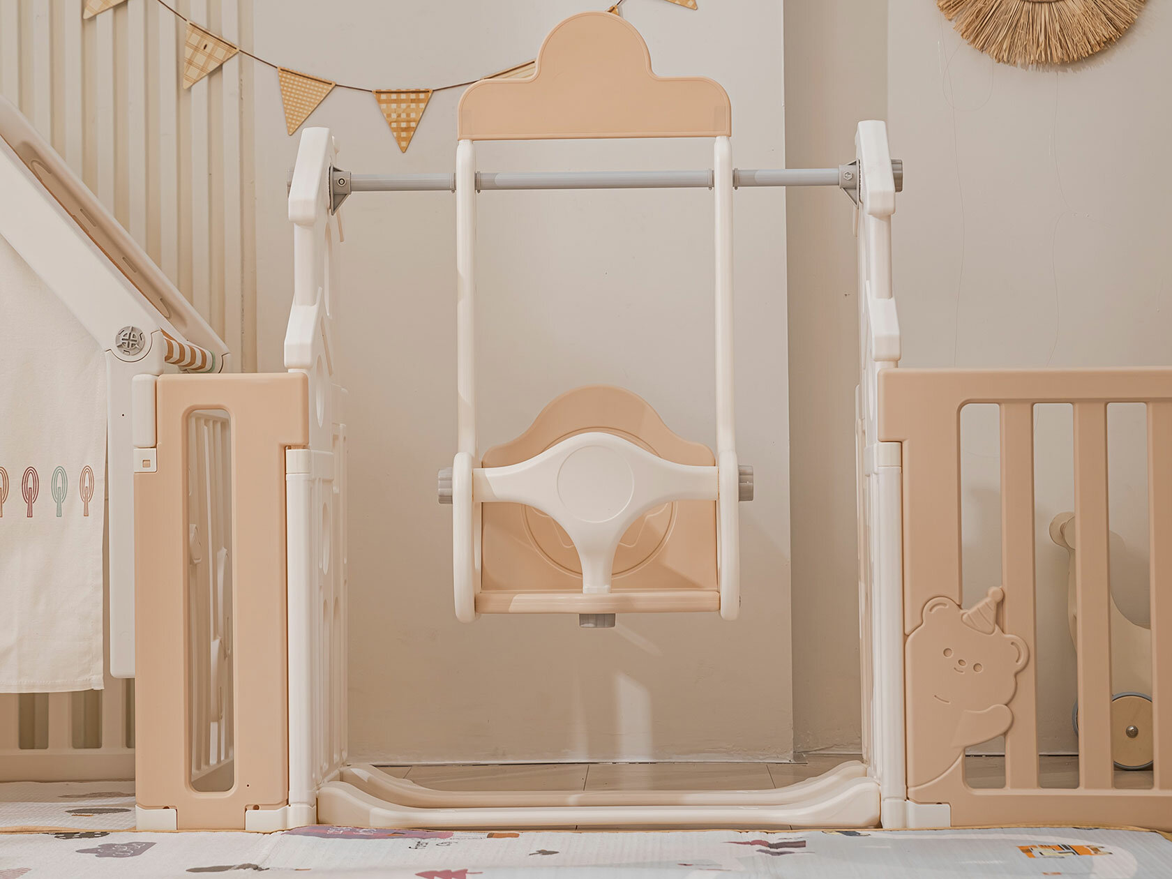 Большой детский игровой манеж/комплекс с качелями UNIX Kids DeLuxe House&Storage 180x200 см Camel из пластика, с домиком, бежевый