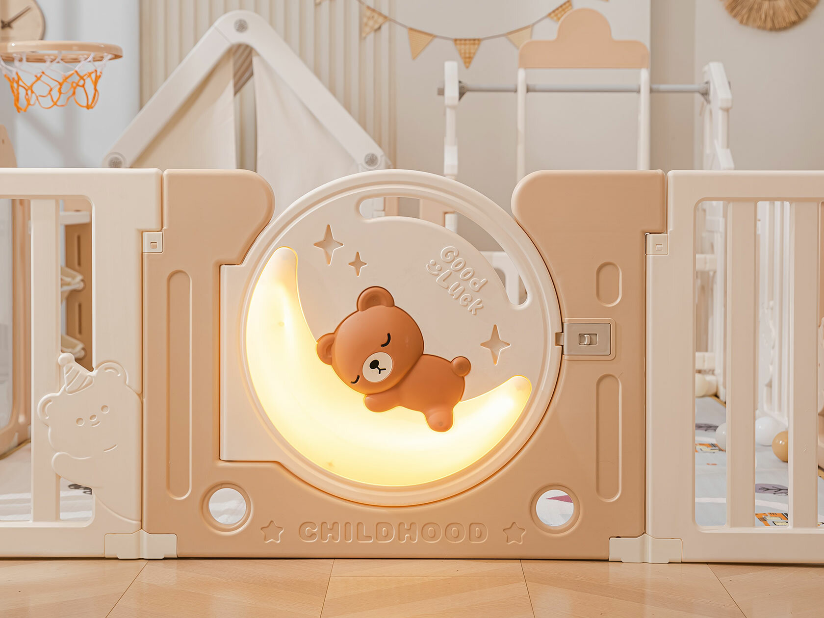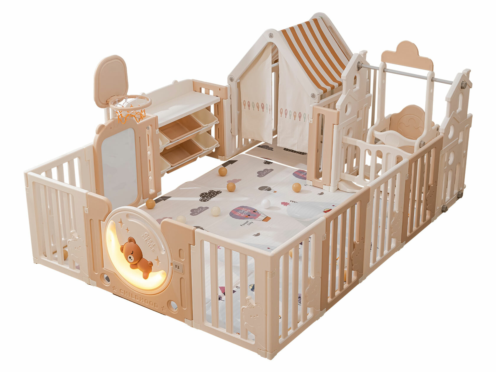 Большой детский игровой манеж, комплекс с качелями UNIX Kids DeLuxe House&Storage 180x200 см Camel из пластика, с домиком, баскетбольной стойкой, мольбертом, стеллажом для игрушек, бежевый