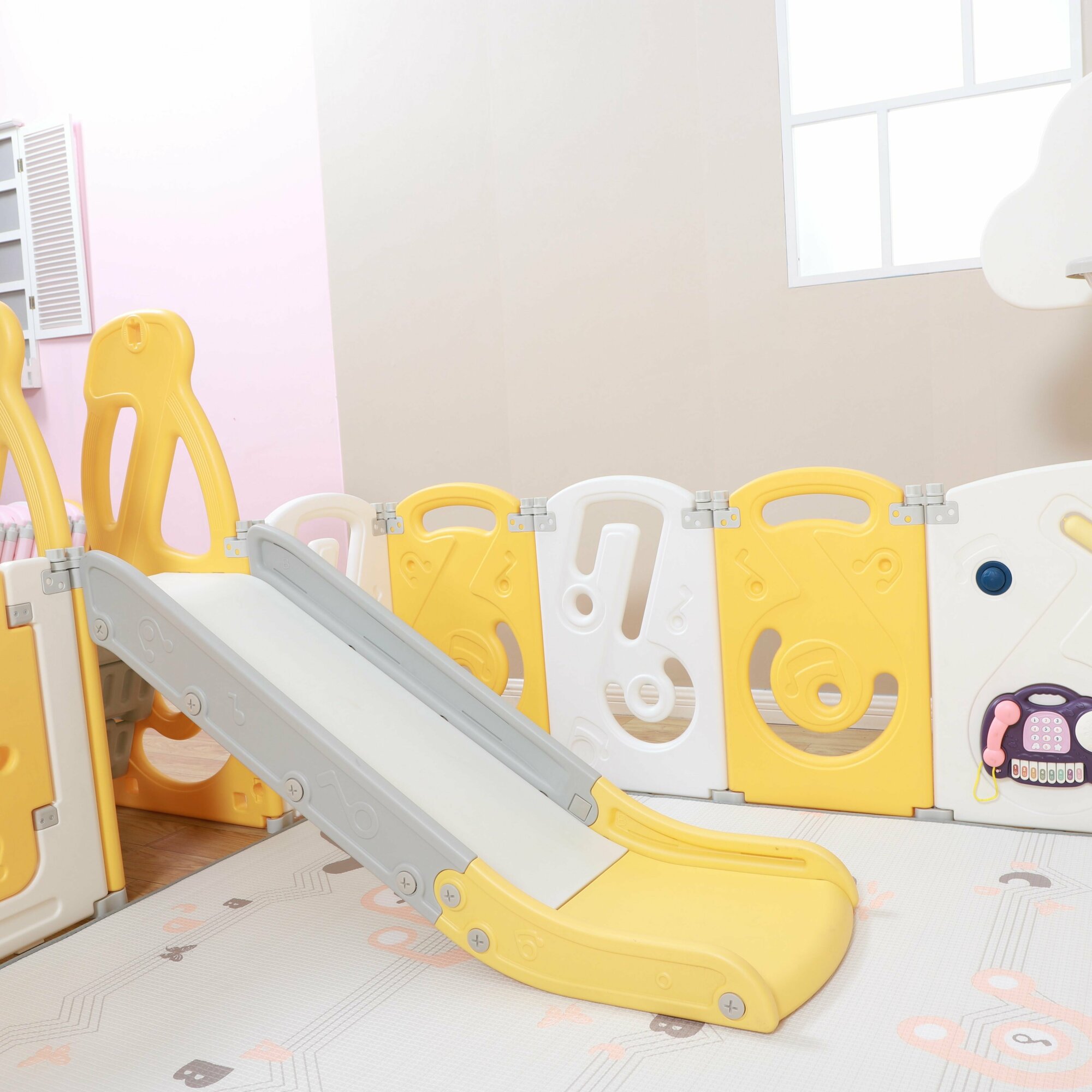 Манеж UNIX Kids "SUPREME Music" Yellow с качелями, желтый/белый, 200x200 см, с ковриком, горкой, баскетбольным кольцом для дома и улицы