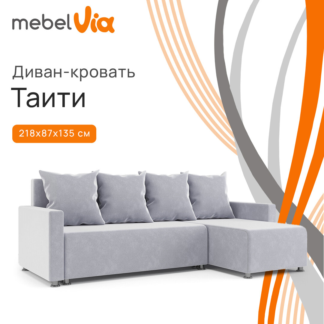 Угловой диван-кровать Таити, с ящиком для белья, велюр, светло-серый, 218х87х135 см, MebelVia