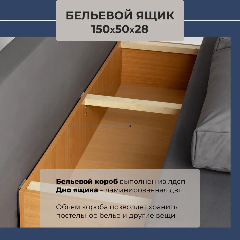 | Особенности | антивандальная обивка, без подлокотников, раскладная конструкция, съемные подушки, ящик для белья |