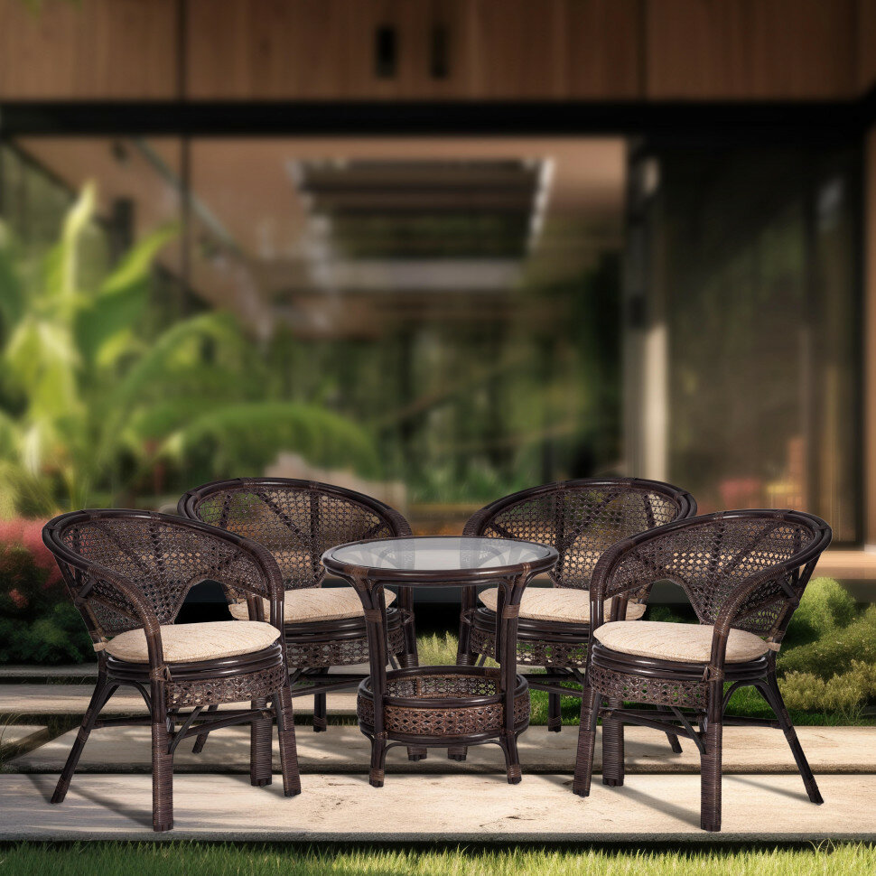 Комплект плетеной мебели из ротанга Tetchair "PELANGI" 02/15 ( стол со стеклом + 4 кресла ) [с подушками] ротанг, кресло 65х65х77см, стол диаметр 64х61см, walnut (грецкий орех)
