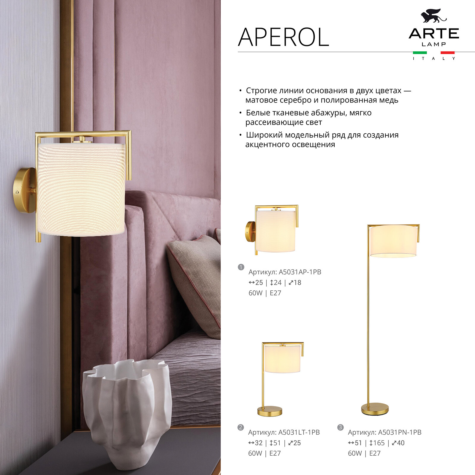 Ниже Вы можете прочитать отзывы на Торшер Arte Lamp APEROL A5031PN-1PB E27 60Вт медный 165 см, ознакомится с подробными характеристиками, посмотреть интересные обзоры и фотографии на Торшер Arte Lamp APEROL A5031PN-1PB E27 60Вт медный 165 см.