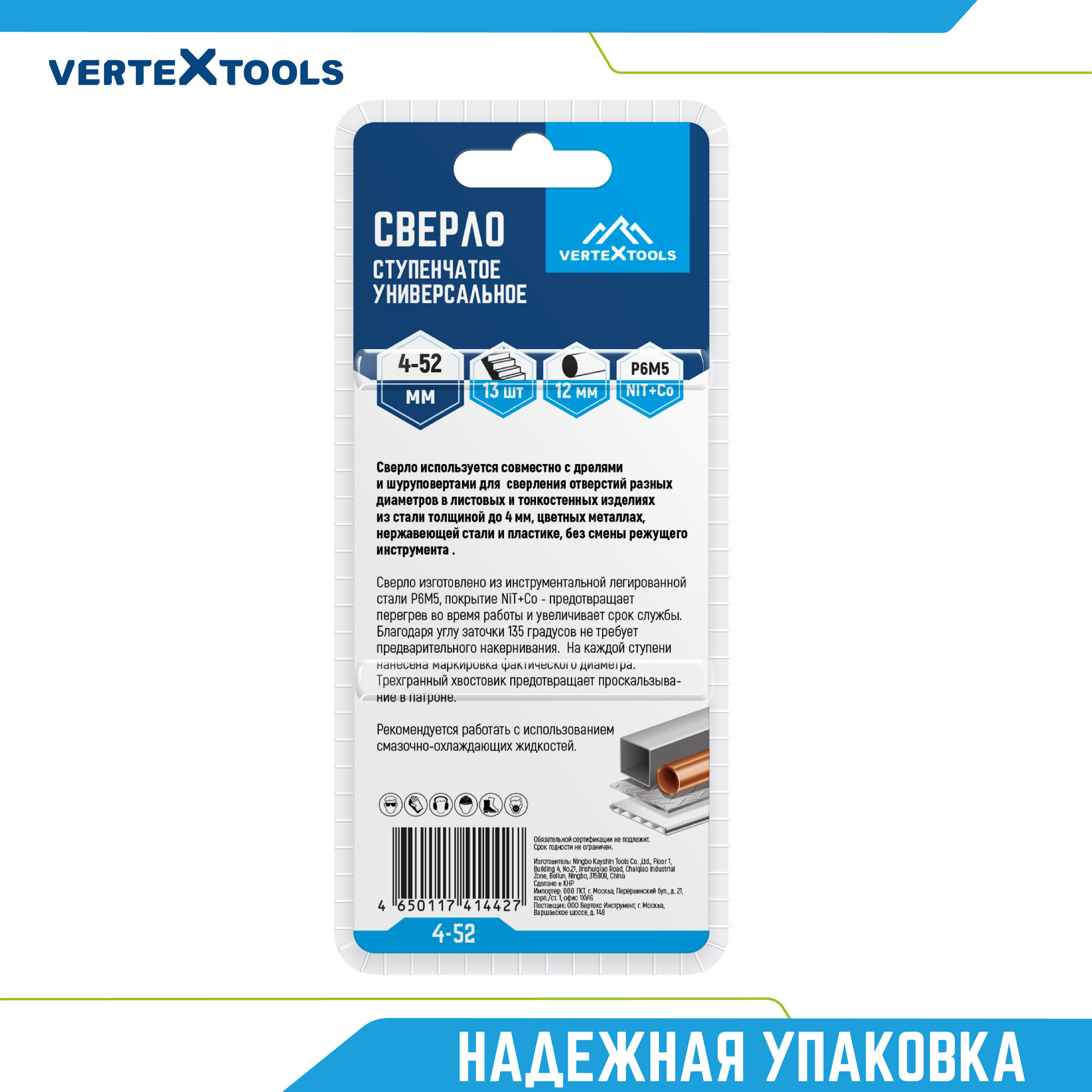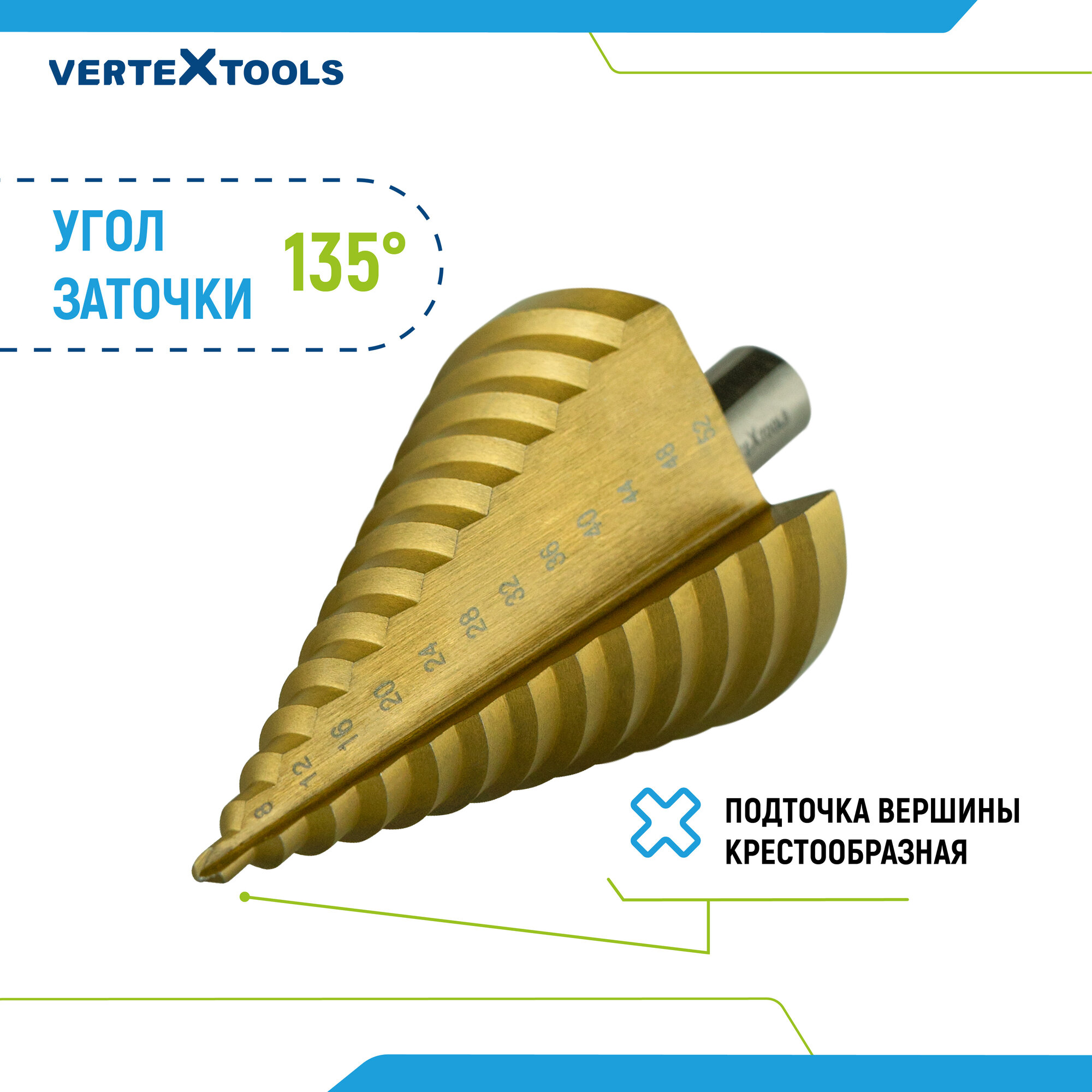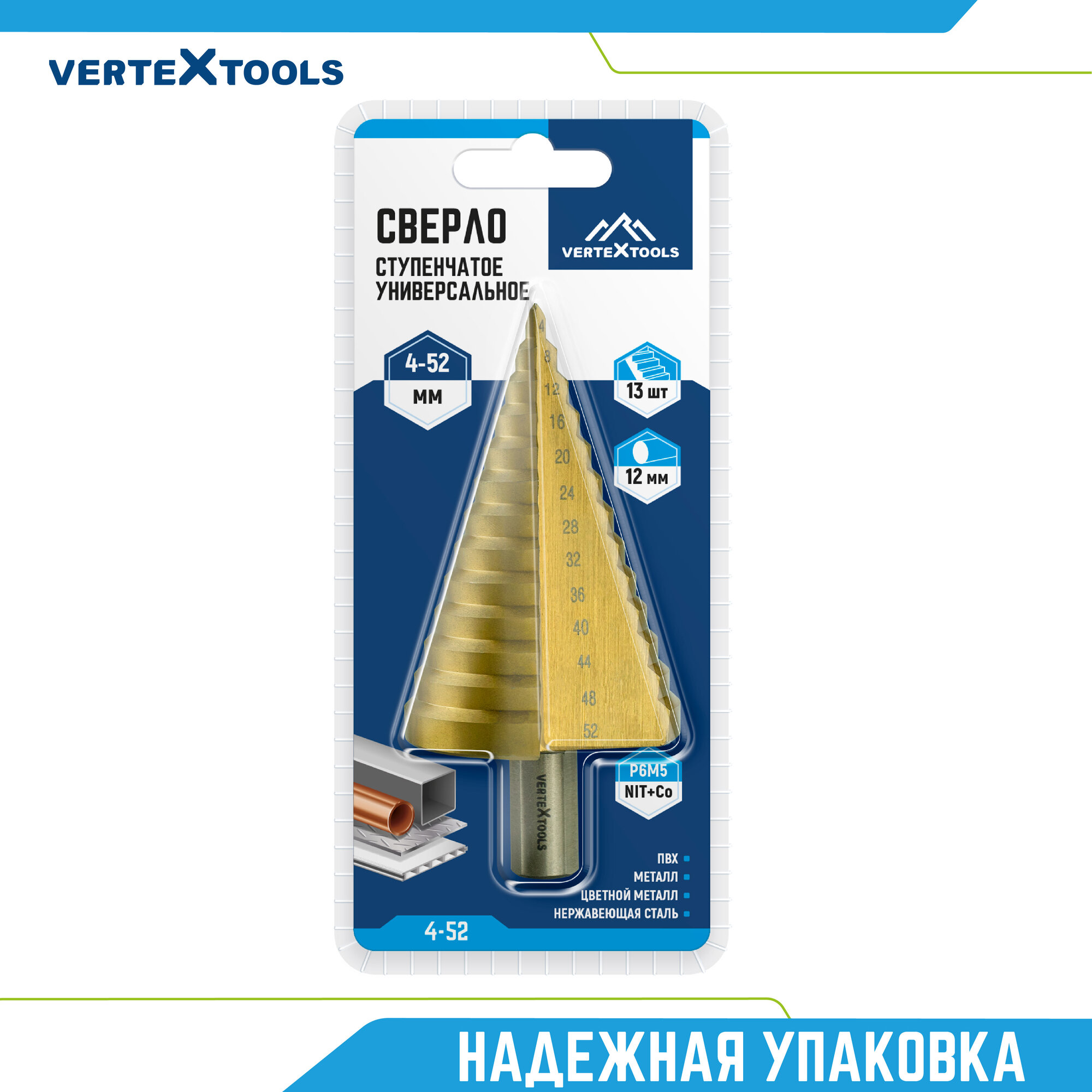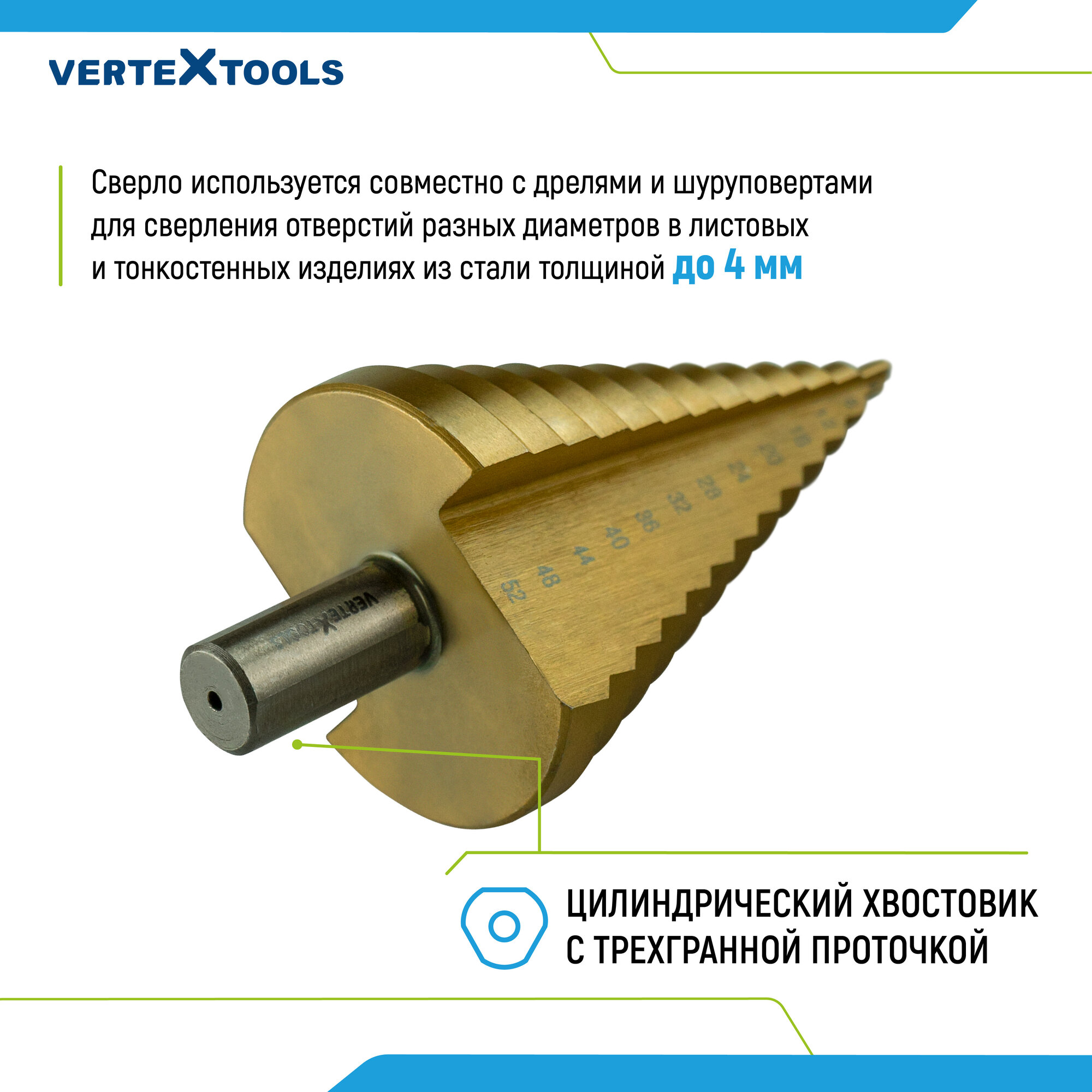 Ступенчатое сверло по металлу vertextools 4-52