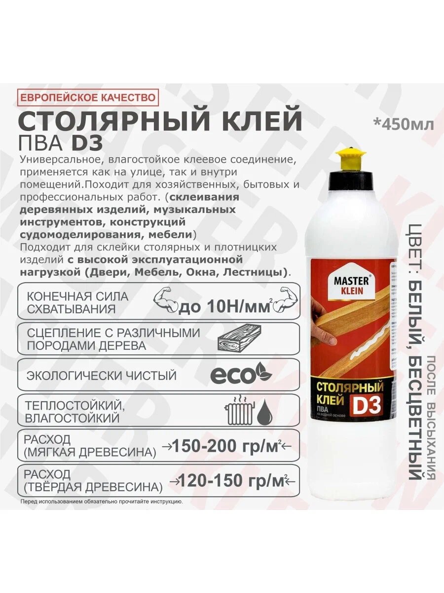 Ниже Вы можете прочитать отзывы на Клей ПВА "Master Klein", столярный, влагостойкий, белый, группа нагрузки Д3, 450мл, ознакомится с подробными характеристиками, посмотреть интересные обзоры и фотографии на Клей ПВА "Master Klein", столярный, влагостойкий, белый, группа нагрузки Д3, 450мл.