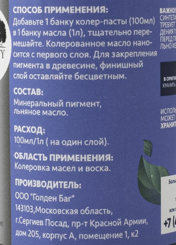 | Дополнительная информация | способ применения: добавьте и смешайте колер - пасты с желаемым составом, в соответствии с рекомендованным количеством для создания необходимого цвета. Возможно получение любых желаемых оттенков. Рекомендуется использовать максимум 40% пигментной пасты от общего веса, в ином случае время сушки масла может существенно увеличиться |