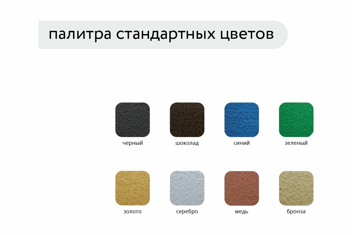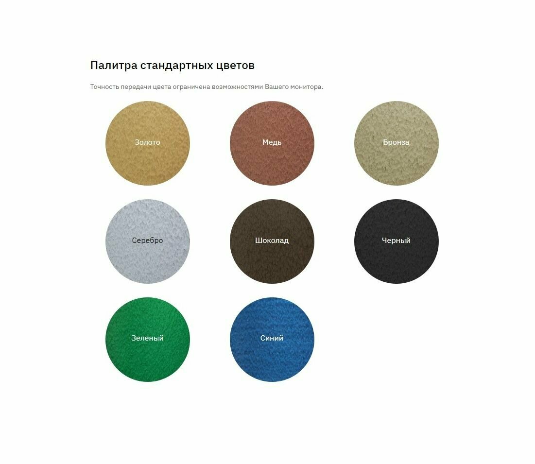 | Цвет товара | Шоколадный, бронза, зелeный, зеленый, золото, медь, серебро, синий, черный, шоколад |