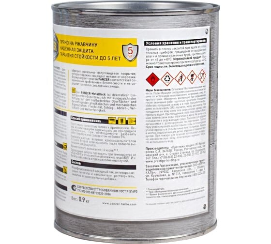 Грунт- эмаль ПО ржавчине гладкая "PANZER" БЕЛАЯ 5 КГ, полуглянцевая, 1ШТ, жестяная банка