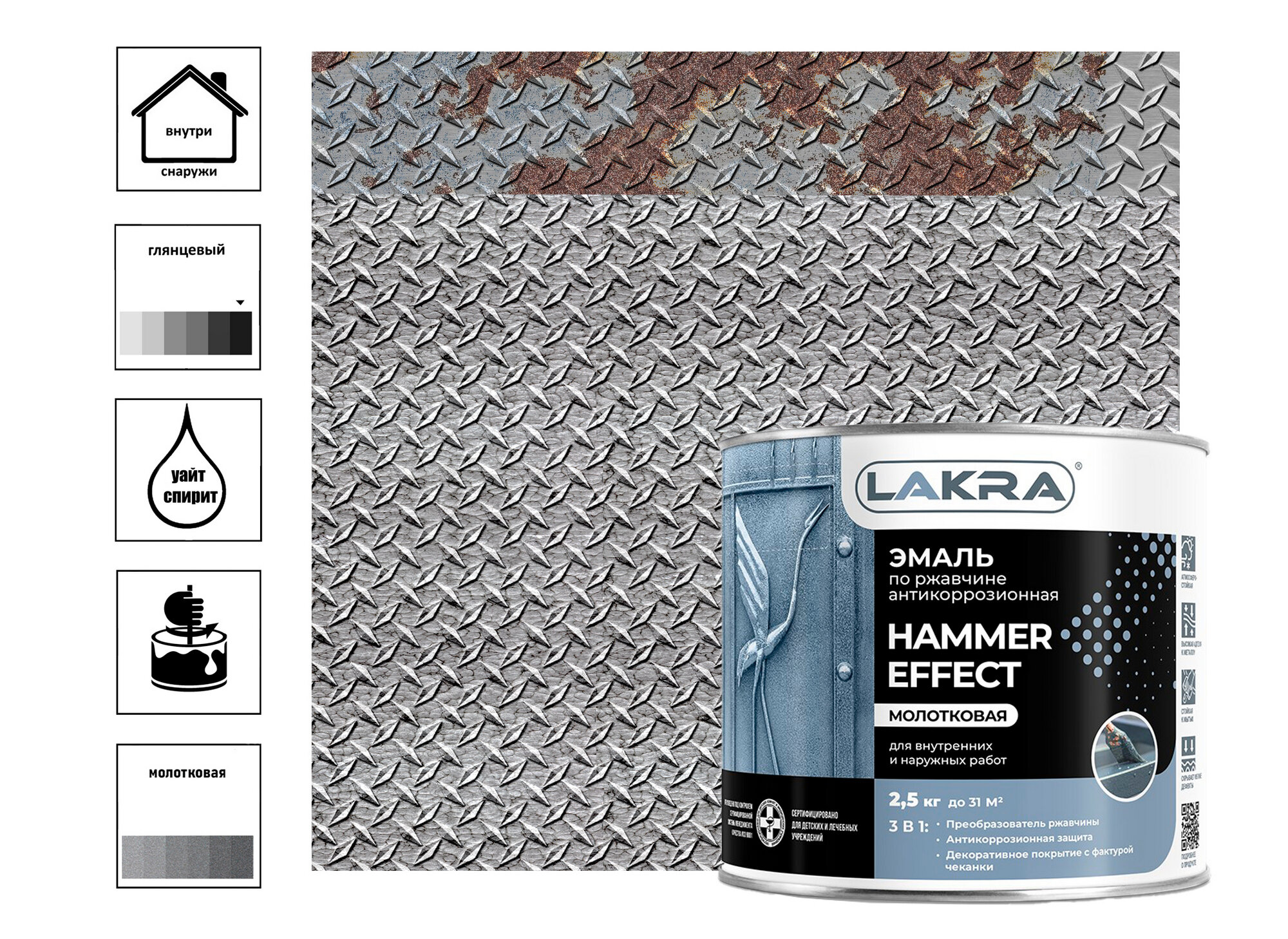 | Дополнительная информация | Высококачественная эмаль на основе алкид-стирольной смолы, сочетает в себе свойства антикоррозионного грунта и декоративной эмали. Применяется для защиты и окраски как чистых, так и ржавых или частично прокорродированных металлических поверхностей с толщиной плотнодержащейся ржавчины до 0,1 мм, а также деревянных поверхностей для создания молоткового эффекта. После высыхания образует глянцевое покрытие с характерным рисунком чеканки (молотковый эффект), скрывающее мелкие дефекты поверхности. Для наружных и внутренних работ. |