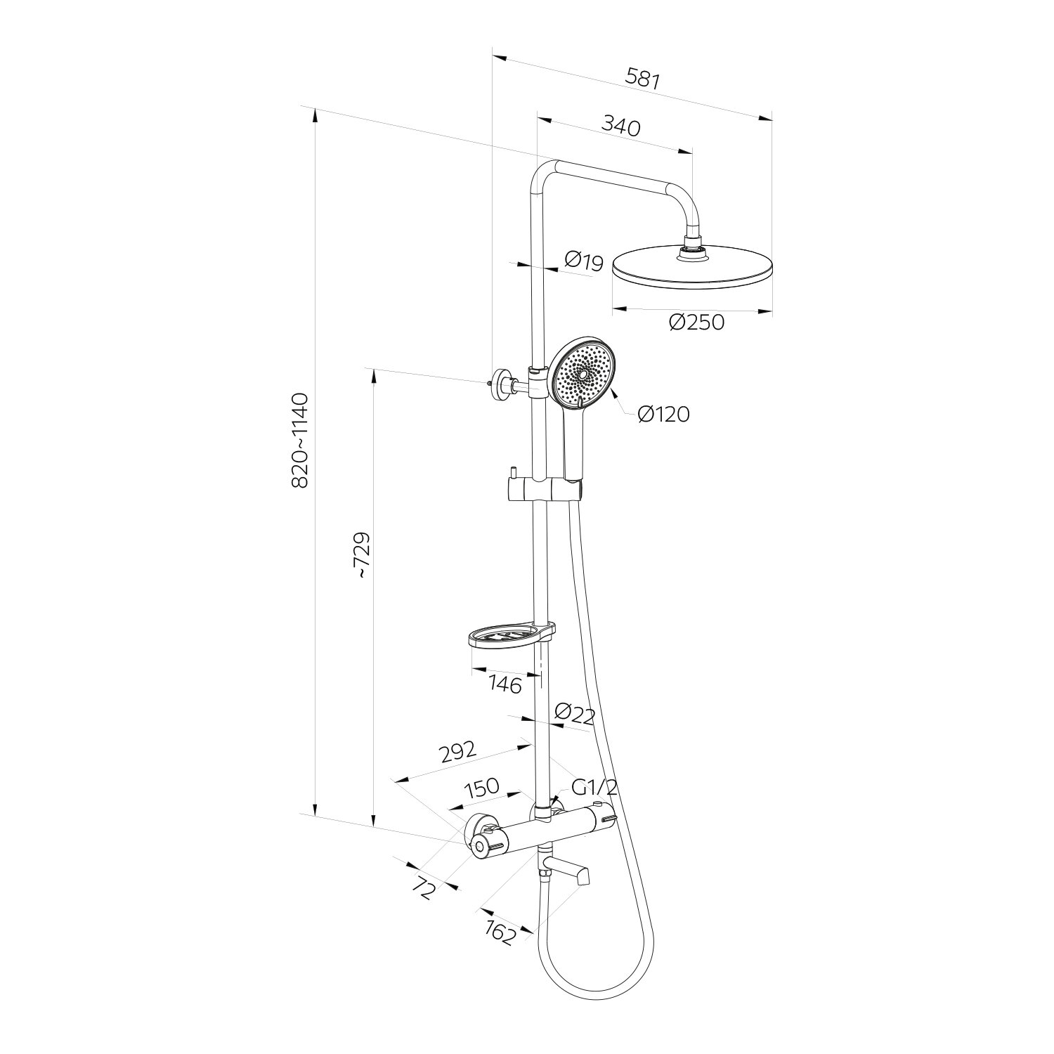 | Комплектация | верхний душ / держатель лейки / дивертор / душевая стойка / кронштейн для верхнего душа / лейка / полочка / ручной душ / Смеситель / шланг / эксцентрик |