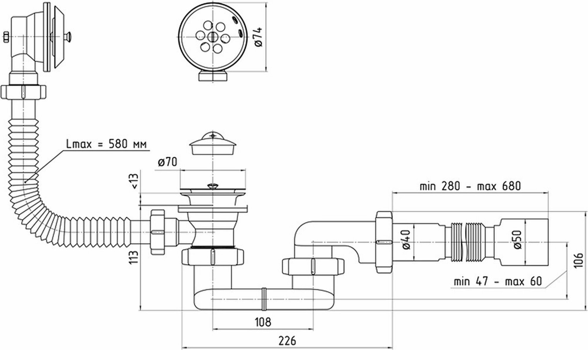 | Дополнительная информация | тип сифона: плоский; решетка слива: Ø70мм при выпуске 1½; высота гидрозатвора: 50 мм; пропускная способность: 24 л/мин; комплектуется гибкой трубкой 40*50 мм для отвода в канализацию; наличие перелива: да |