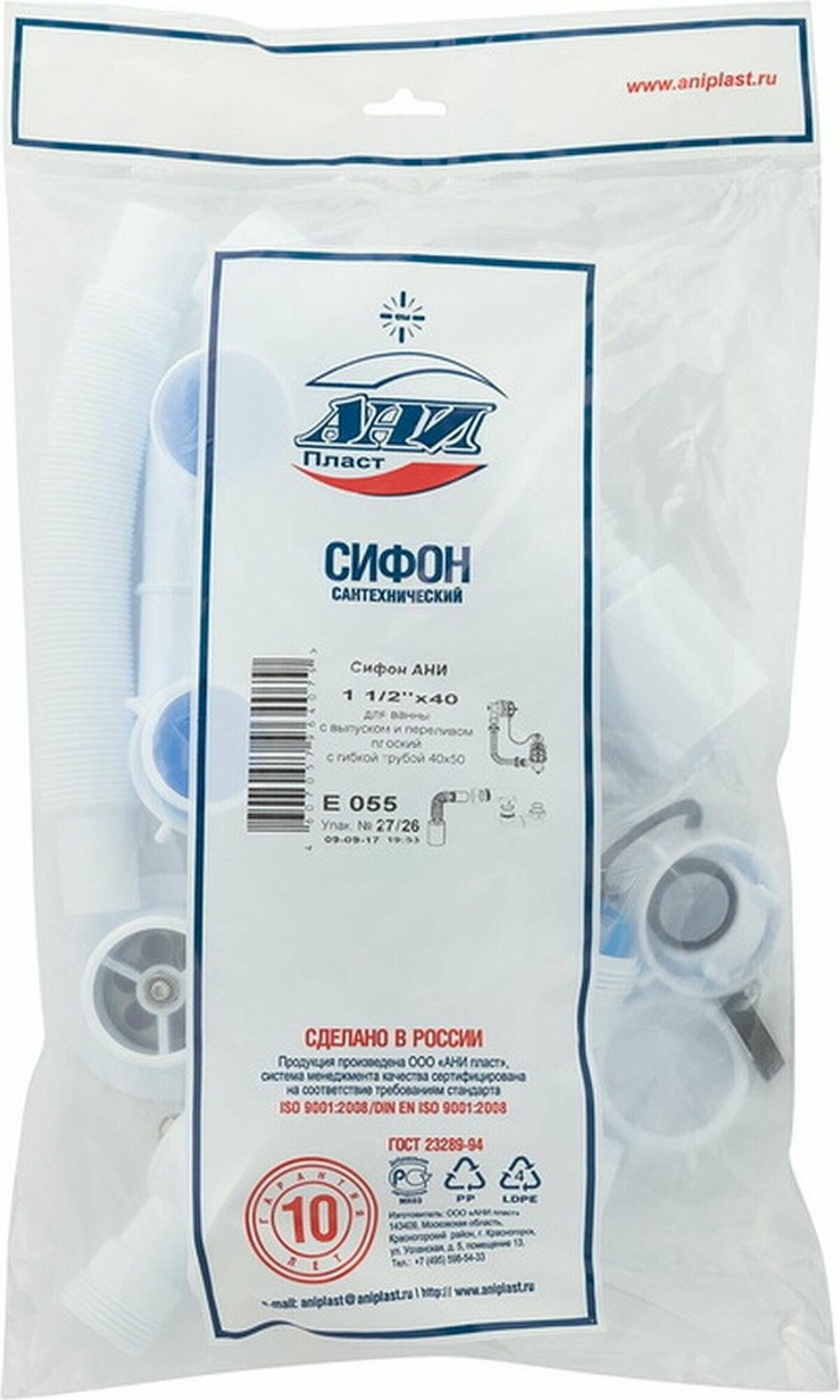 Сифон АНИ Пласт для ванны, плоский, с выпуском 1 1/2"х40, с переливом, с гибкой трубой 40х50, нержав .