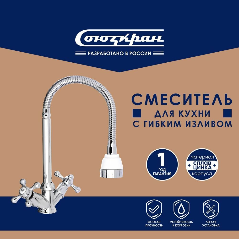 Купить Смеситель для кухни СоюзКран, гибкий излив, кер. кран-буксы 1/2, хром, цинк, SK01-F204