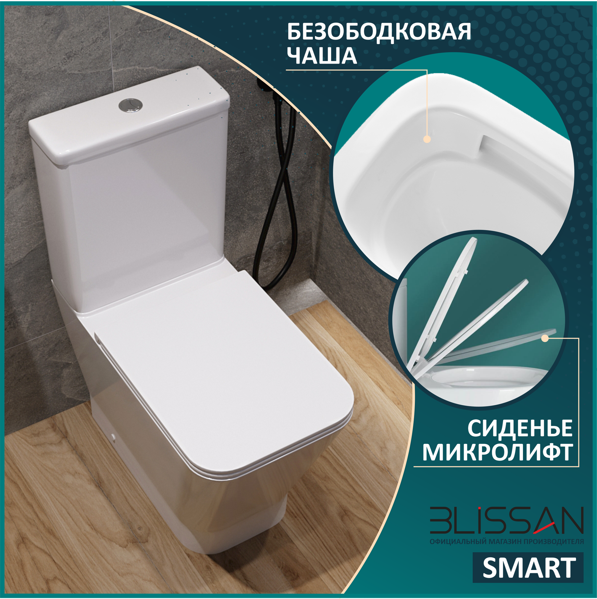 Унитаз напольный Smart Торнадо 3.0 безободковый компакт BLISSAN с сиденьем дюропласт микролифт, быстросъемное