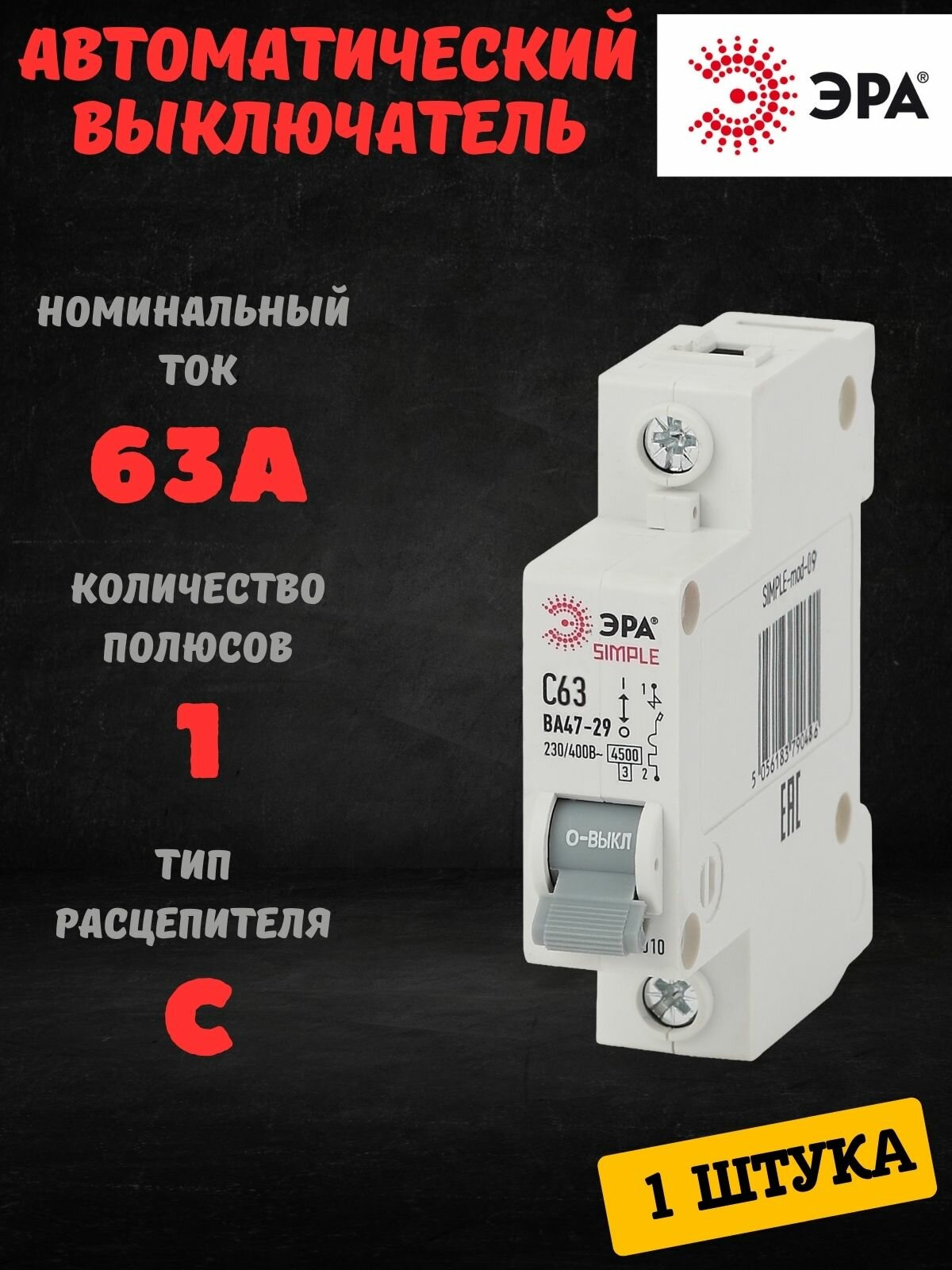 Автоматический выключатель 1P (1П) 63А (C) 4,5кА ВА 47-29 SIMPLE-mod-09 ЭРА Б0039226 1шт