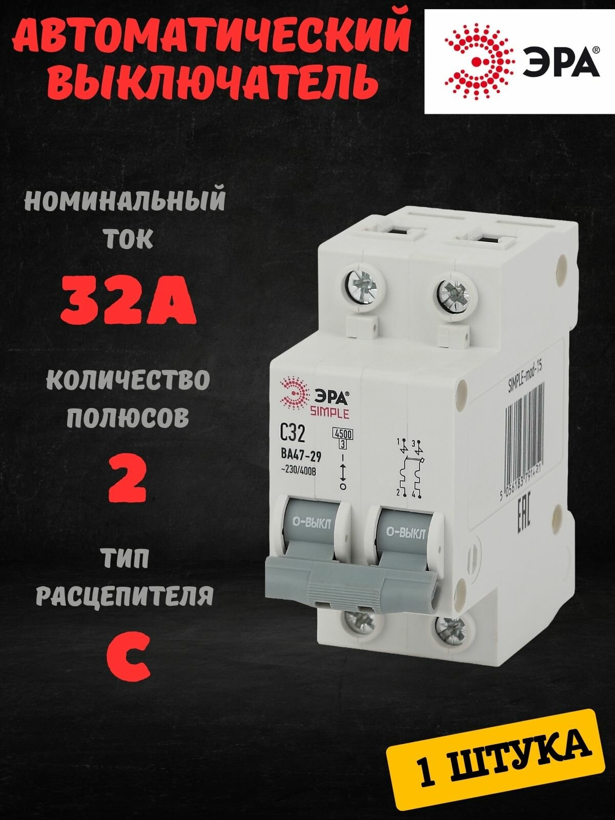 Автомат Б0039232 ЭРА SIMPLE-mod-15 2P 32А (C) 4,5кА выключатель ВА 47-29