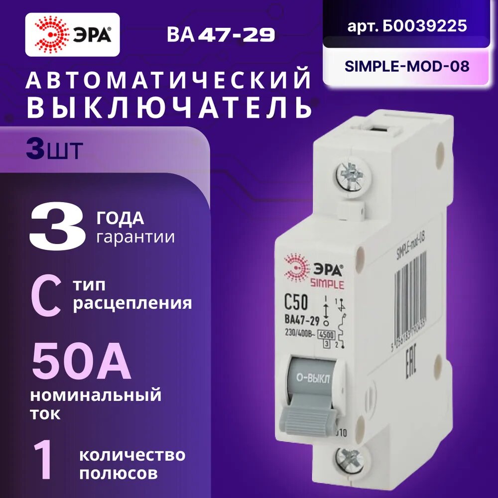 Купить Автоматический выключатель 1P (1П) 50А (C) 4,5кА ВА 47-29 SIMPLE-mod-08 ЭРА Б0039225 3шт
