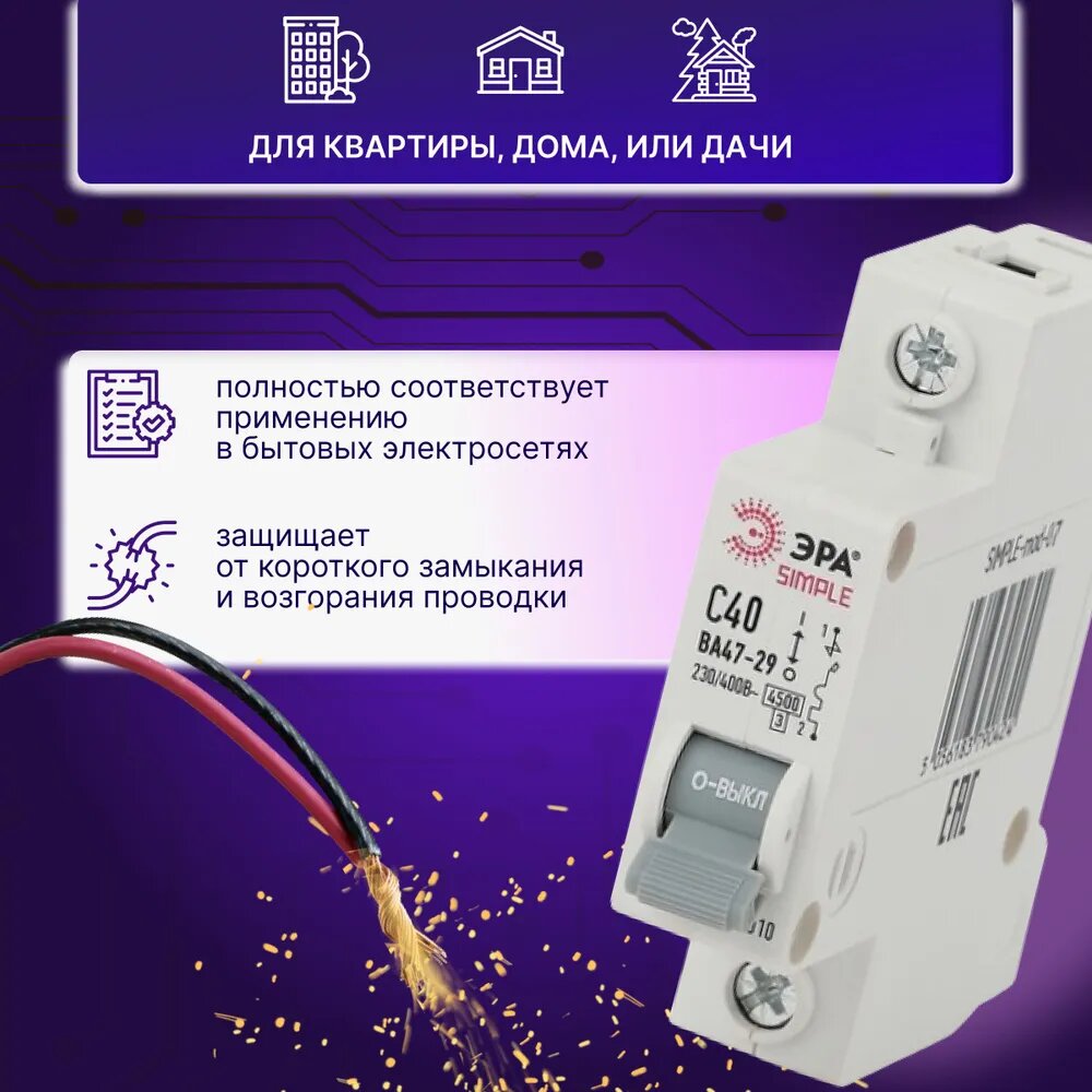 СохранитьАвтоматический выключатель 1P (1П) 40А (C) 4,5кА ВА 47-29 SIMPLE-mod-07 ЭРА Б0039224 3шт интересное: