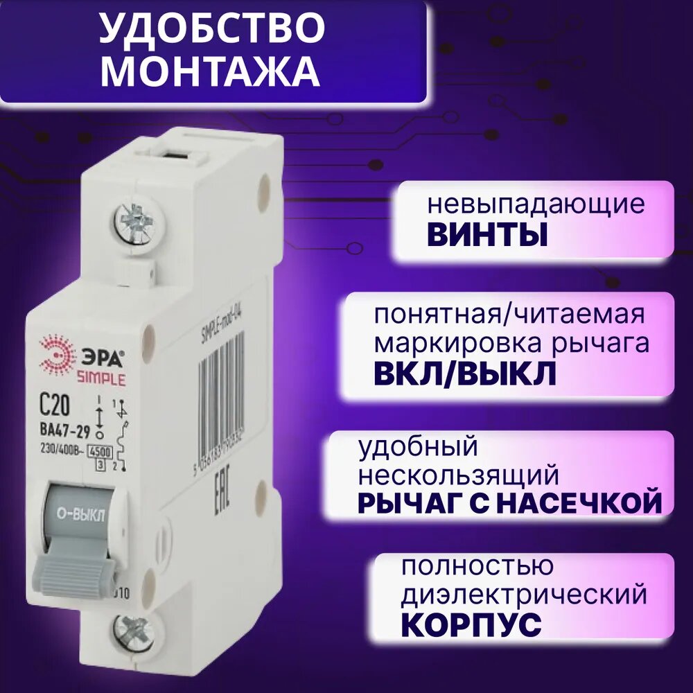 Купить Автоматический выключатель 1P (1П) 20А (C) 4,5кА ВА 47-29 SIMPLE-mod-04 ЭРА Б0039221 6шт