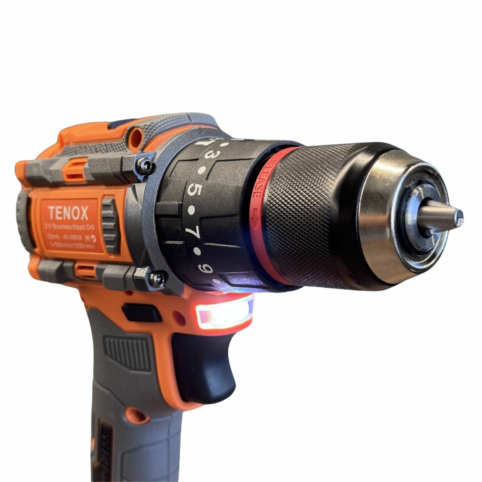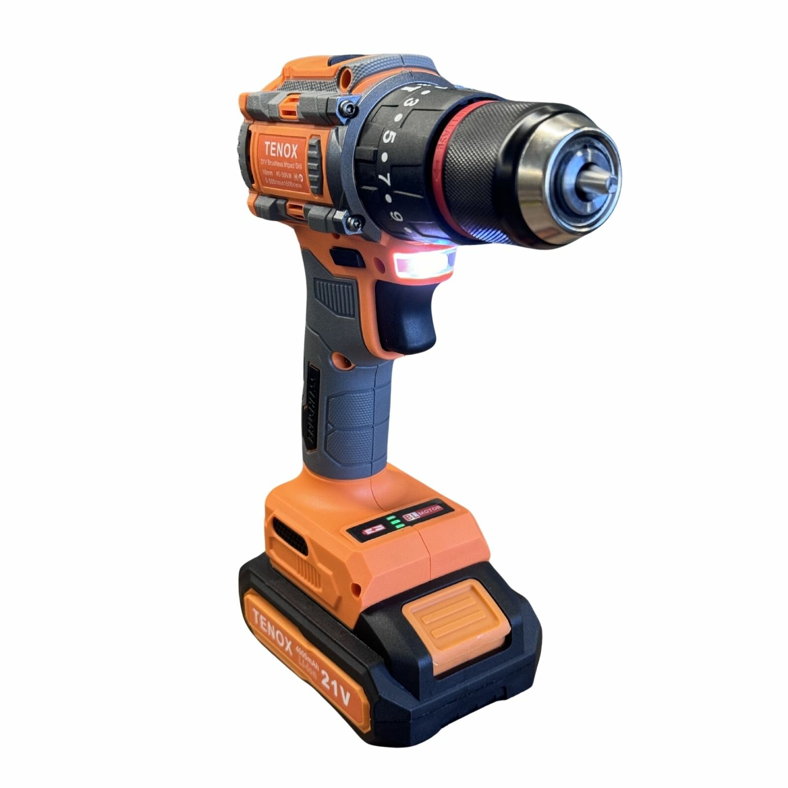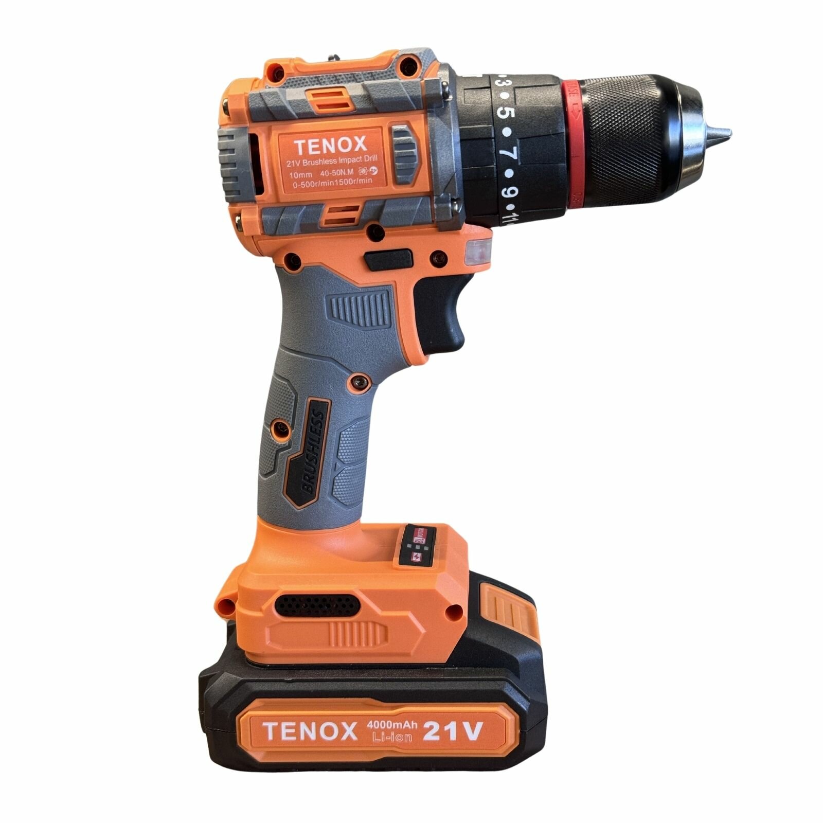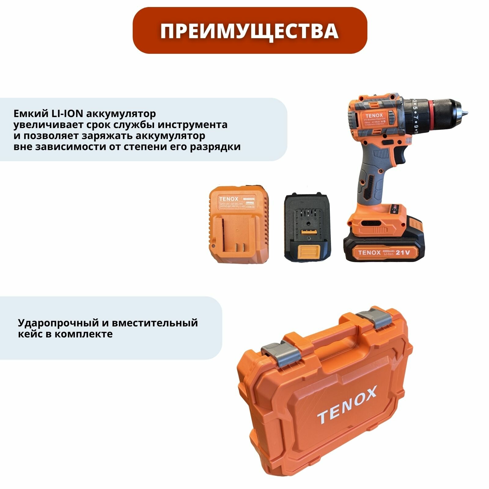 TENOX 21Vf Шуруповерт ударный бесщеточный аккумуляторный электрический, дрель-шуруповерт в кейсе, 21 В, 50 Нм, 2 АКБ LI-ION, 2 Ач