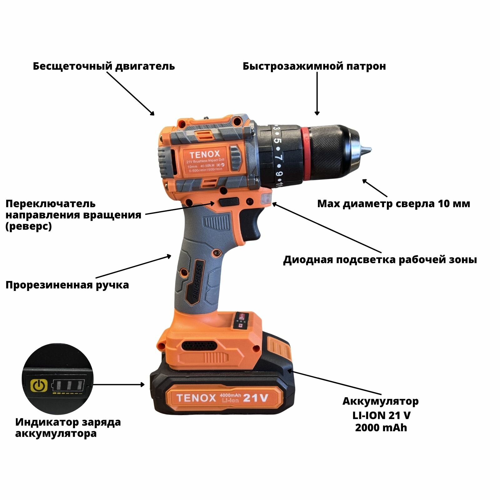 Купить TENOX 21Vf шуруповерт аккумуляторный бесщеточный / дрель шуруповерт аккумуляторная 21 В, 50 Нм, 2 АКБ LI-ION, 2 Ач
