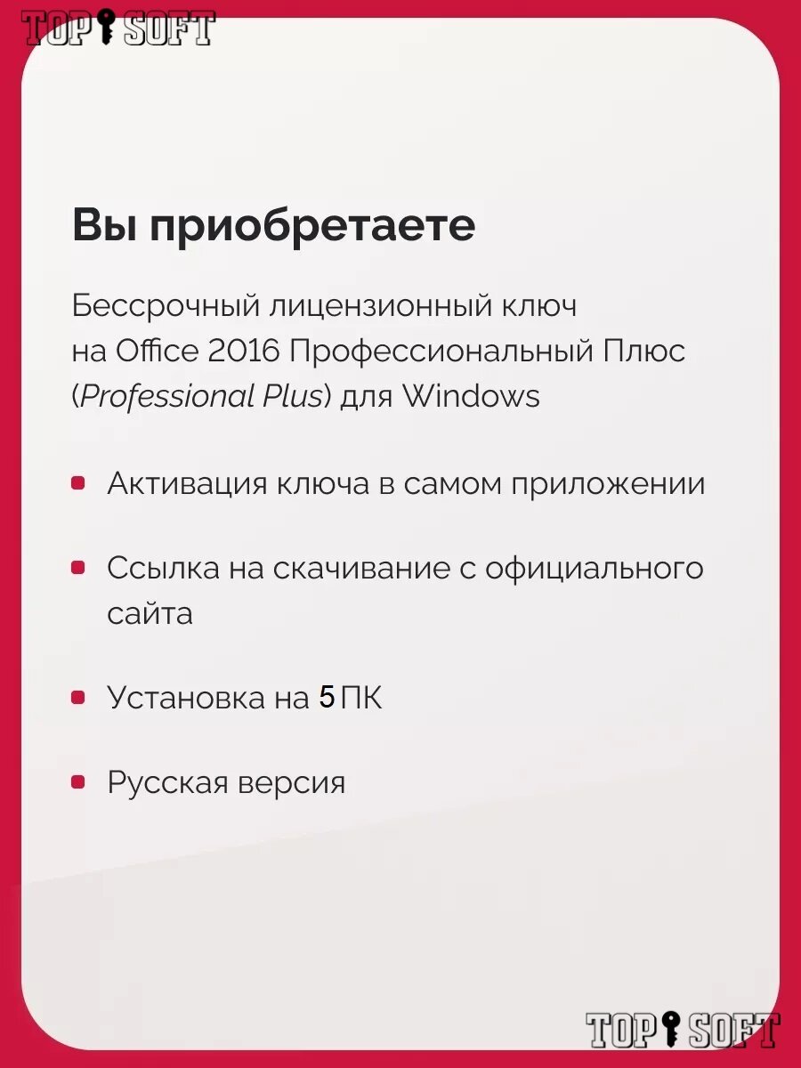 | Дополнительная информация | Электронный ключ активации для 2х Microsoft Office 2016 Pro Plus для Windows 7,8.1,10,11 |