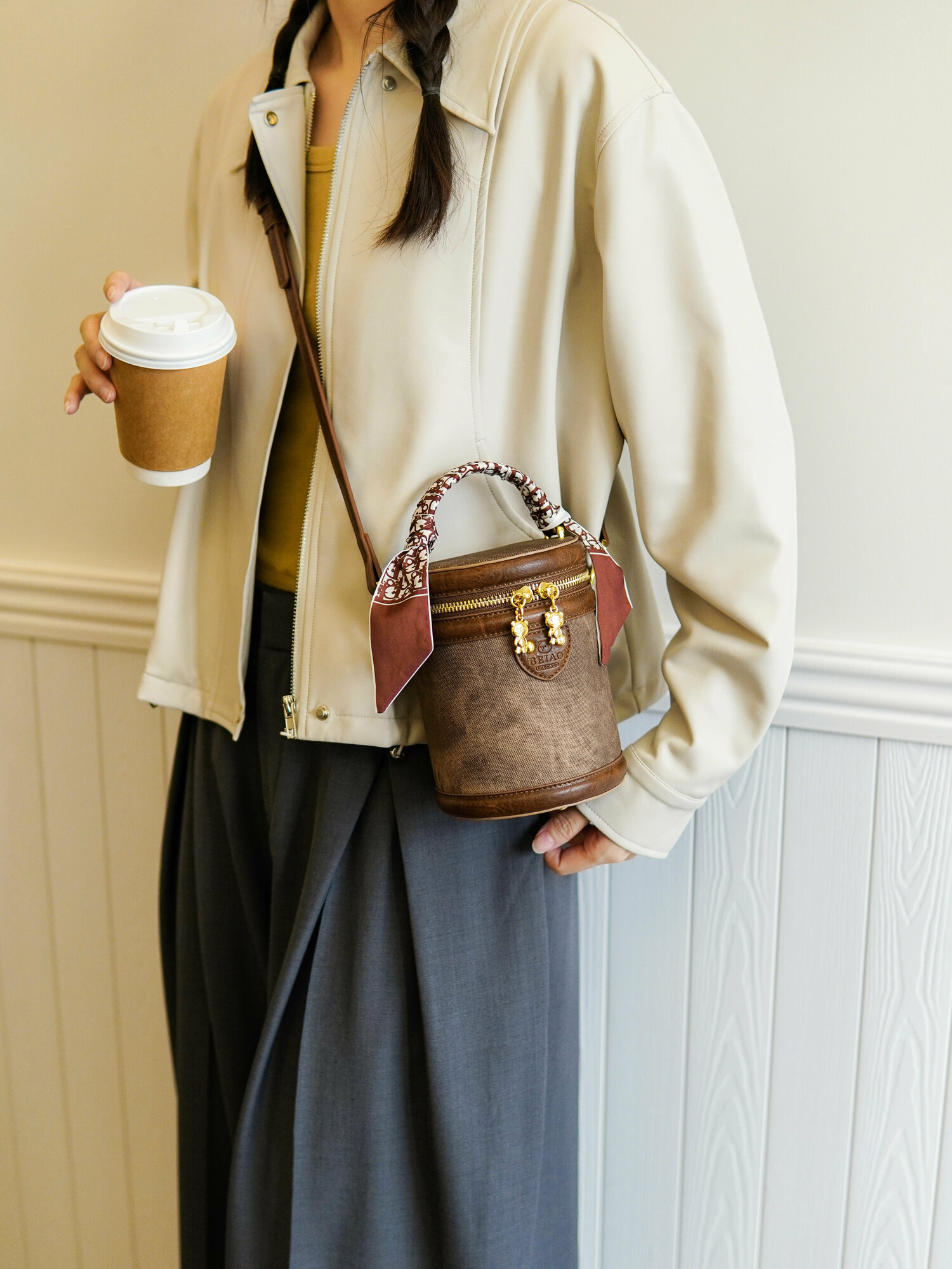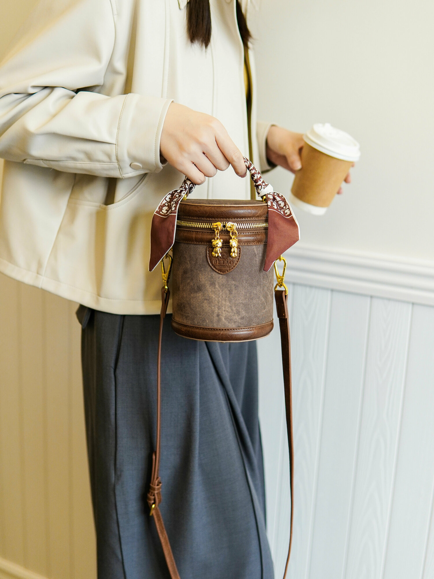 Женская сумка-бочонок Beibaobao,бежевая, с плечевым ремнем, на все сезоны y2k