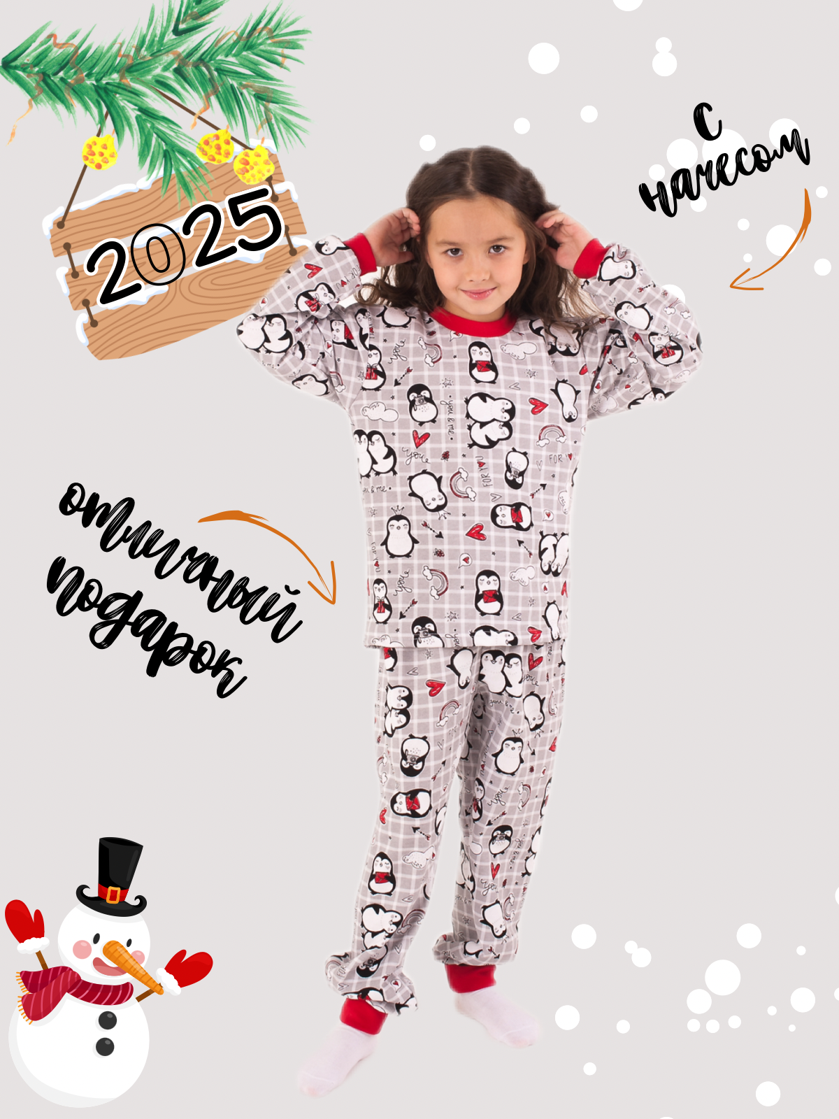Пижама с начесом, снеговик и штаны в клетку, размер 122
