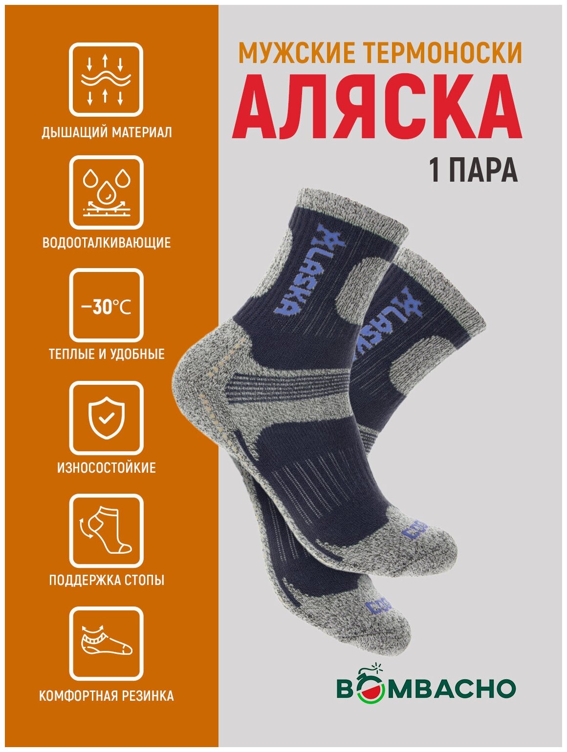 Мужские термоноски Bombacho, Аляска, размер 41-46, 1 пара, Черный