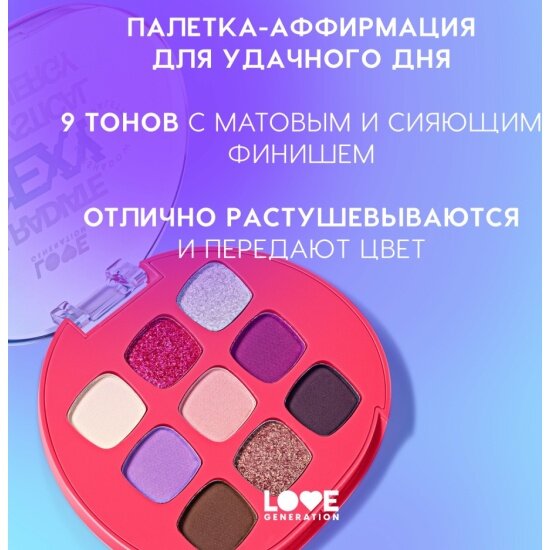 СохранитьПалетка теней для век Love Generation I radiate sexy mystical energy высокопигментированные оттенки, равномерное нанесение, тон 01, 9 оттенков, 7,2 г интересное: