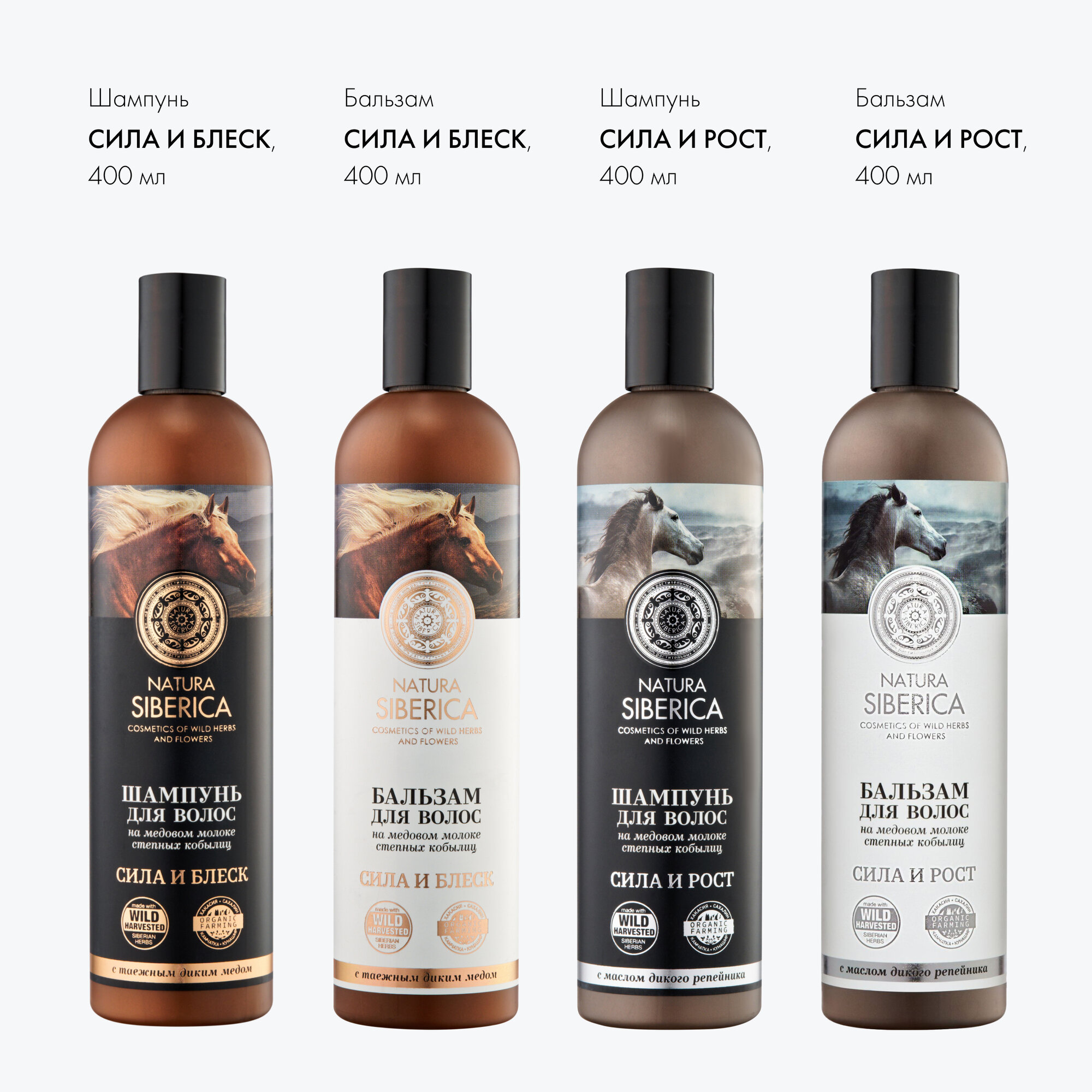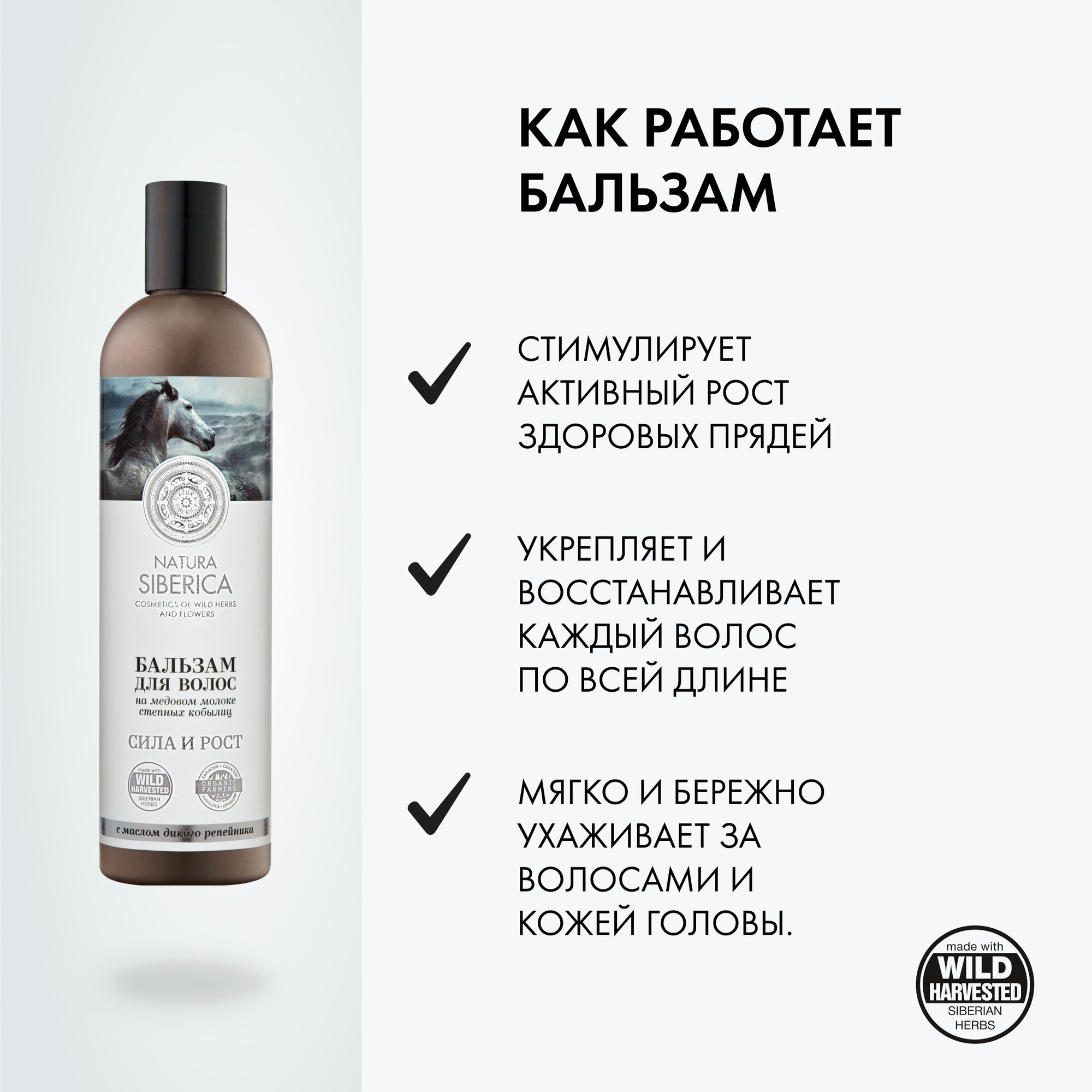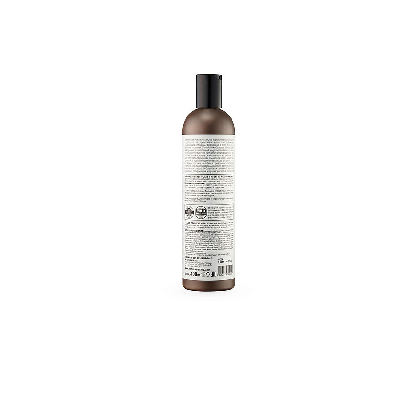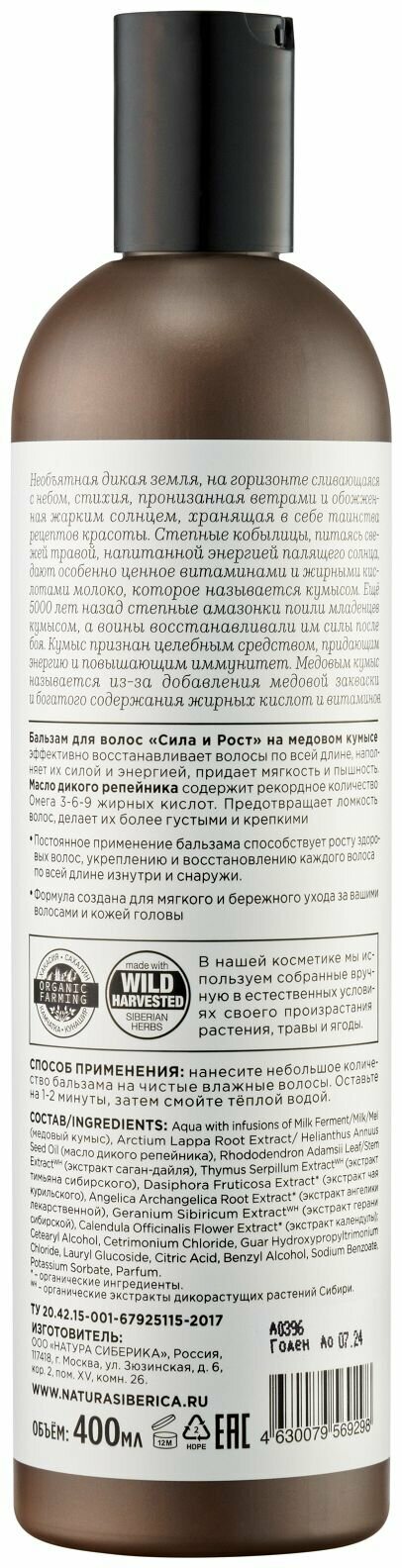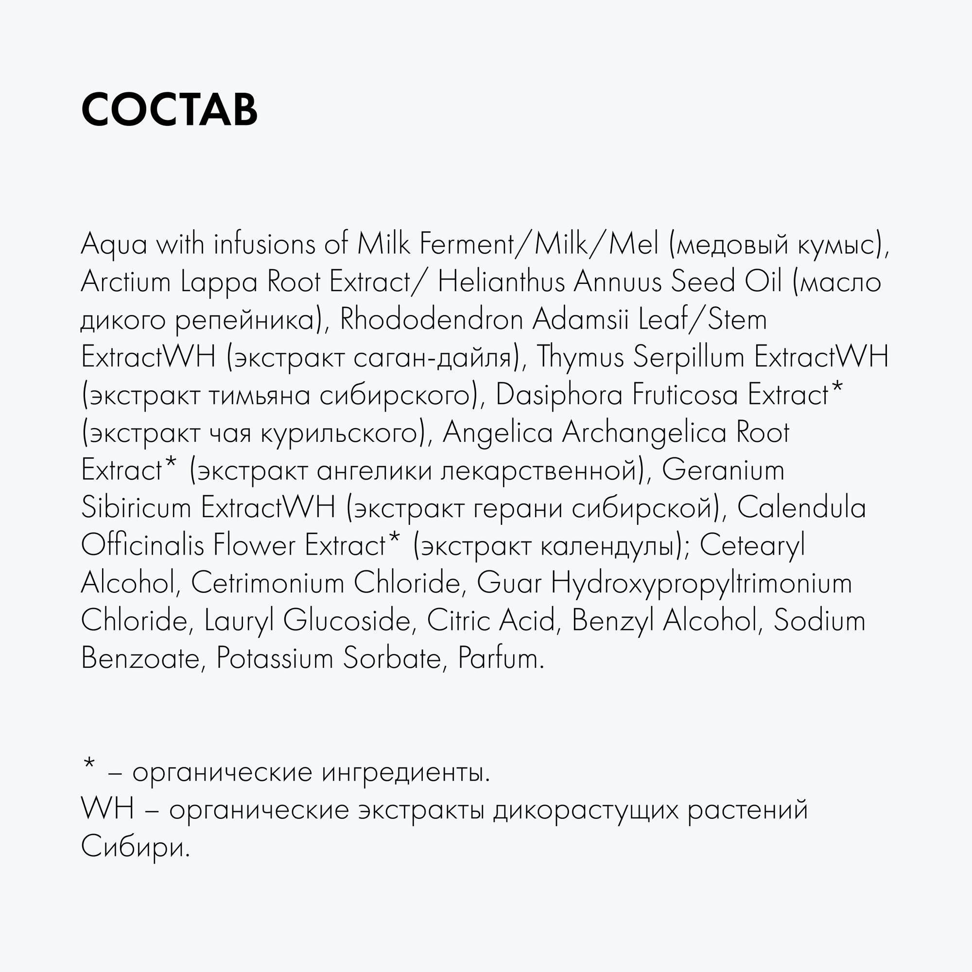 | Состав | Aqua with infusions of Milk Ferment/Milk/Mel (медовый кумыс), Arctium Lappa Root Extract/ Helianthus Annuus Seed Oil (масло дикого репейника), Rhododendron Adamsii Leaf/Stem ExtractWH (экстракт саган-дайля), Thymus Serpillum ExtractWH (экстракт тимьяна сибирского), Dasiphora Fruticosa Extract (экстракт чая курильского), Angelica Archangelica Root Extract (экстракт ангелики лекарственной), Geranium Sibiricum ExtractWH (экстракт герани сибирской), Calendula Officinalis Flower Extract (экстракт календулы) Cetearyl Alcohol, Cetrimonium Chloride, Guar Hydroxypropyltrimonium Chloride, Lauryl Glucoside, Citric Acid, Benzyl Alcohol, Sodium Benzoate, Potassium Sorbate, Parfum. – органические ингредиенты. WH – органические экстракты дикорастущих растений Сибири. |